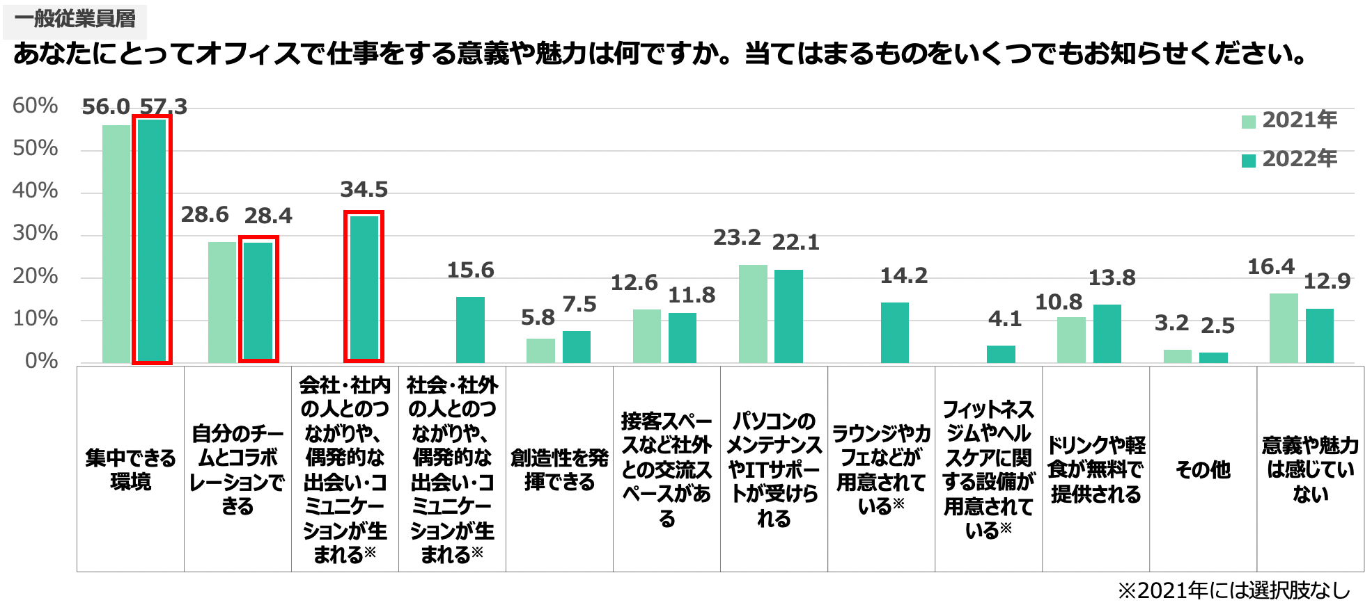 8. 一般従業員にとって、オフィスで仕事をする意義TOP3は「集中できる(57.3%)」「社内の人との繋がり・偶発的な出会い(34.5%)」「チームとのコラボレーション(28.4%)」。昨年ランクインした「ITサポートが受けられる」よりも、「コミュニケーション」がオフィスの意義として重要視される。これは、経営者・人事・総務の回答も同じ順位でランクインしている。特に、大企業の経営者層においては、「社内の人との繋がり・偶発的な出会い」「チームとのコラボレーション」のポイントが、全体および中小企業の経営者層よりも高い結果となった。