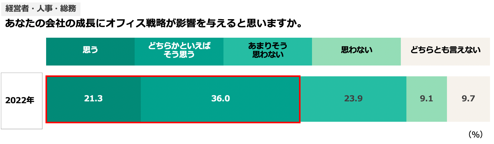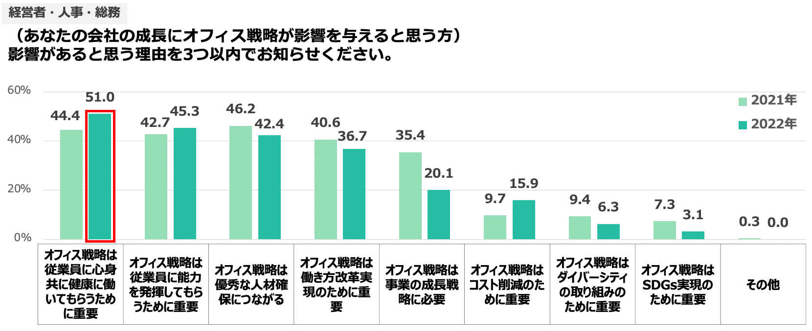 働き方改革を推進する企業は増えていますが、コロナ禍長期化において従業員が業務上感じている課題として「精神面の負担(40.7%)」が最も高く昨年より上昇。5割以上の経営層が、「オフィス戦略は従業員に心身共に健康に働いてもらうために重要である」と答えており、従業員の課題を認識しています。また、従業員・経営者層のどちらにおいても、企業の成長のためには「オフィス環境や働きやすい環境が整備されている」ことがトップ回答となりました。環境や制度の整備を含め、ウィズコロナ時代のオフィス戦略が今後ますます重要になると考えられます。