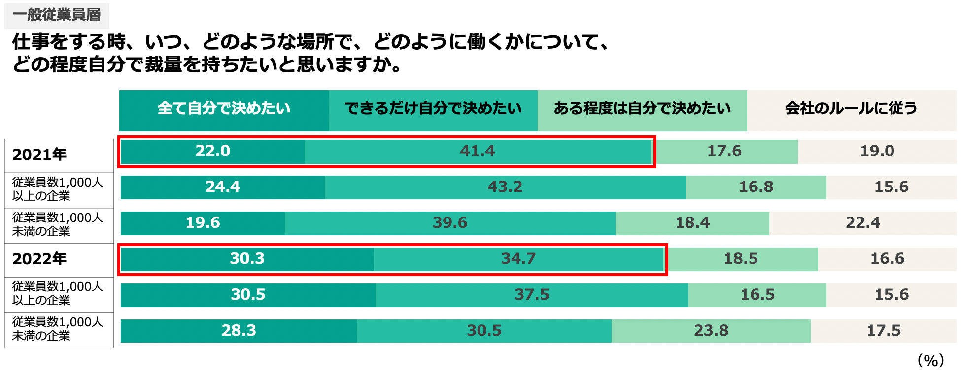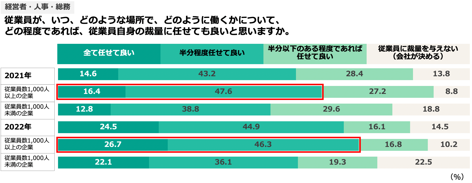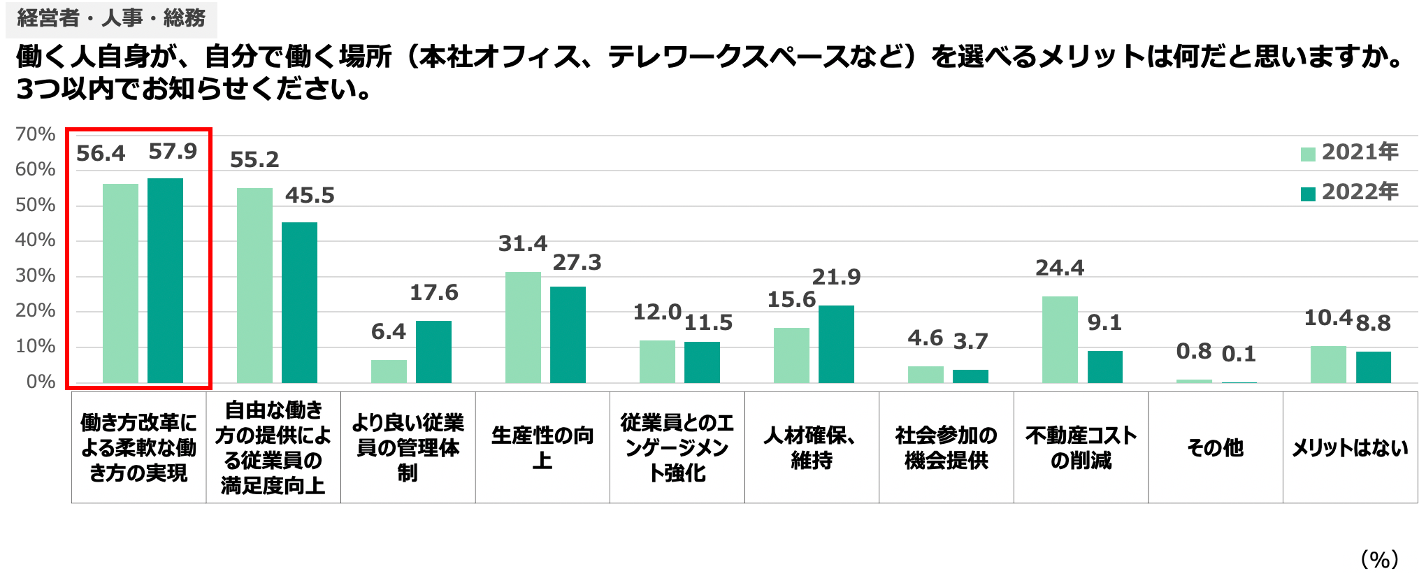 3. 一般従業員のうち、いつ、どこで、どのように働くかについて、「全て自分で決めたい」「できるだけ自分で決めたい」と回答した人が全体65%(昨年63.4%)、一方で、69.4%の経営者層は「全て任せて良い」「半分程度任せて良い」と答えた。内訳を見ると、従業員数1,000人以上の企業は73%、従業員数1,000人未満の企業は58.2%、となっており、従業員数の多い企業の経営者の方が裁量権を従業員に与えても良いと考えていることがわかった。また、経営者層が考える、従業員が自分で働く場所(本社オフィス、テレワークスペースなど)を選択できるメリットは、「働き方改革による柔軟な働き方の実現(57.9%)」がトップ。従業員の意識と乖離がなく、経営者層の回答も柔軟な働き方が重要だと考えている。