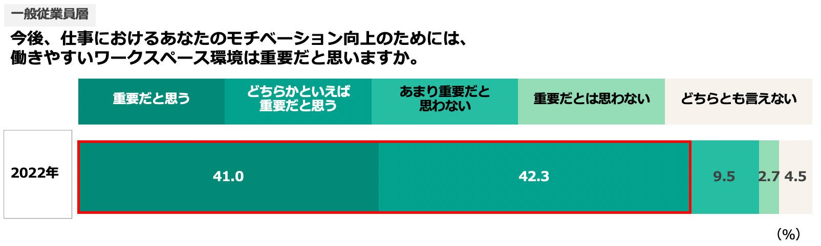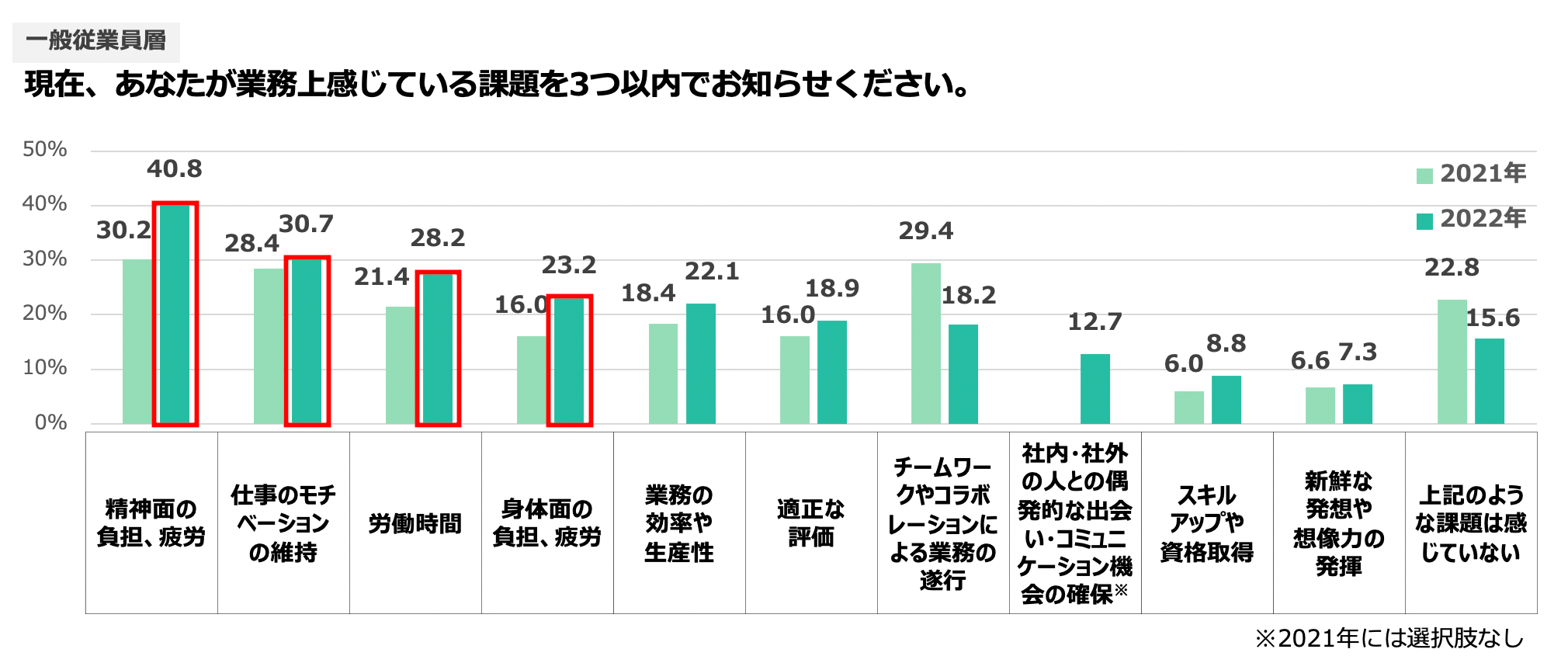 9. 一般従業員が業務上感じている課題として「精神面の負担(40.7%)」が突出して高く(昨年30.3%)、続いて「モチベーションの維持(30.7%)」「労働時間(28.2%)」「身体面の負担、疲労(23.2%)」の順番に高い。コロナ禍長期化における心身の負担が高まっていること明らかに。また、今後、仕事におけるモチベーション向上のために働きやすいワークスペースが重要であると答えたのは、83.3%。また、会社の成長にオフィス戦略が影響を与えると答えた経営者層57.3%のうち、その理由のトップとして挙げられたのは、「オフィス戦略は従業員に心身共に健康に働いてもらうために重要(51%)」となった。これにより、経営者層に対する質問からも心身への影響に課題を感じていることが判明した。