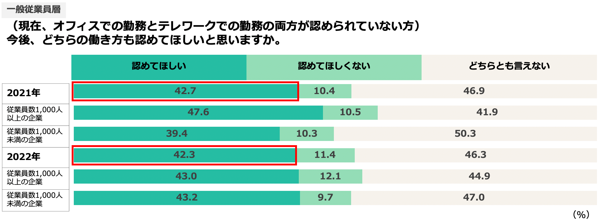 2. 一般従業員のうち、オフィス勤務とテレワーク勤務の両方が認められていない人の4割が、今後ハイブリットワークを認めてほしいと回答。