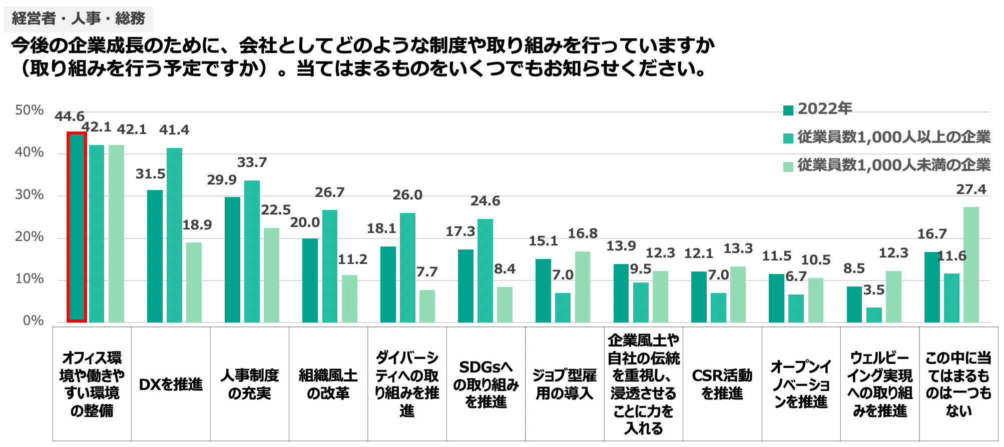 従業員・経営者層の両方で、企業成長のために「オフィス環境や働きやすい環境の整備」が最も重要という結果に