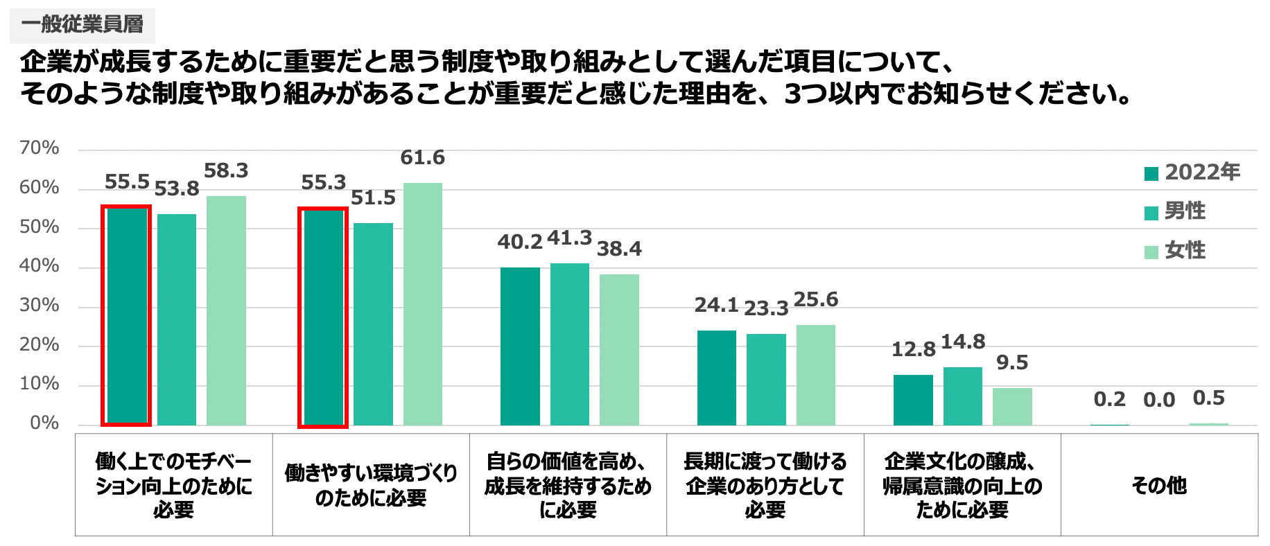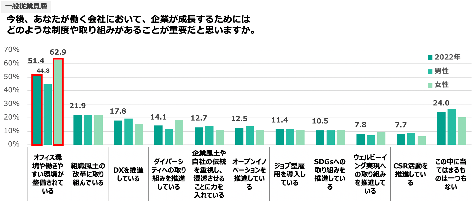 7. 一般従業員が、自ら働く企業が成長するために重要だと思う制度や取り組みとして「オフィス環境や働きやすい環境が整備されている」ことがトップの回答(51.4%)。特に女性の割合が62.9%と高い結果となった。このような制度や取り組みがあることが重要だと感じた理由としては、同等1位で「働く上でのモチベーション向上のために必要(55.5%)」「働きやすい環境づくりのために必要(55.3%)」という結果に。経営者層においても、今後の企業成長のために、会社としてどのような制度や取り組みを行っていますか(取り組みを行う予定ですか)という質問に対して「オフィス環境や働きやすい環境の整備(44.6%)」がトップの回答 となり、従業員側、企業側のどちらにおいても、オフィス環境を重要視していることが明らかとなった。