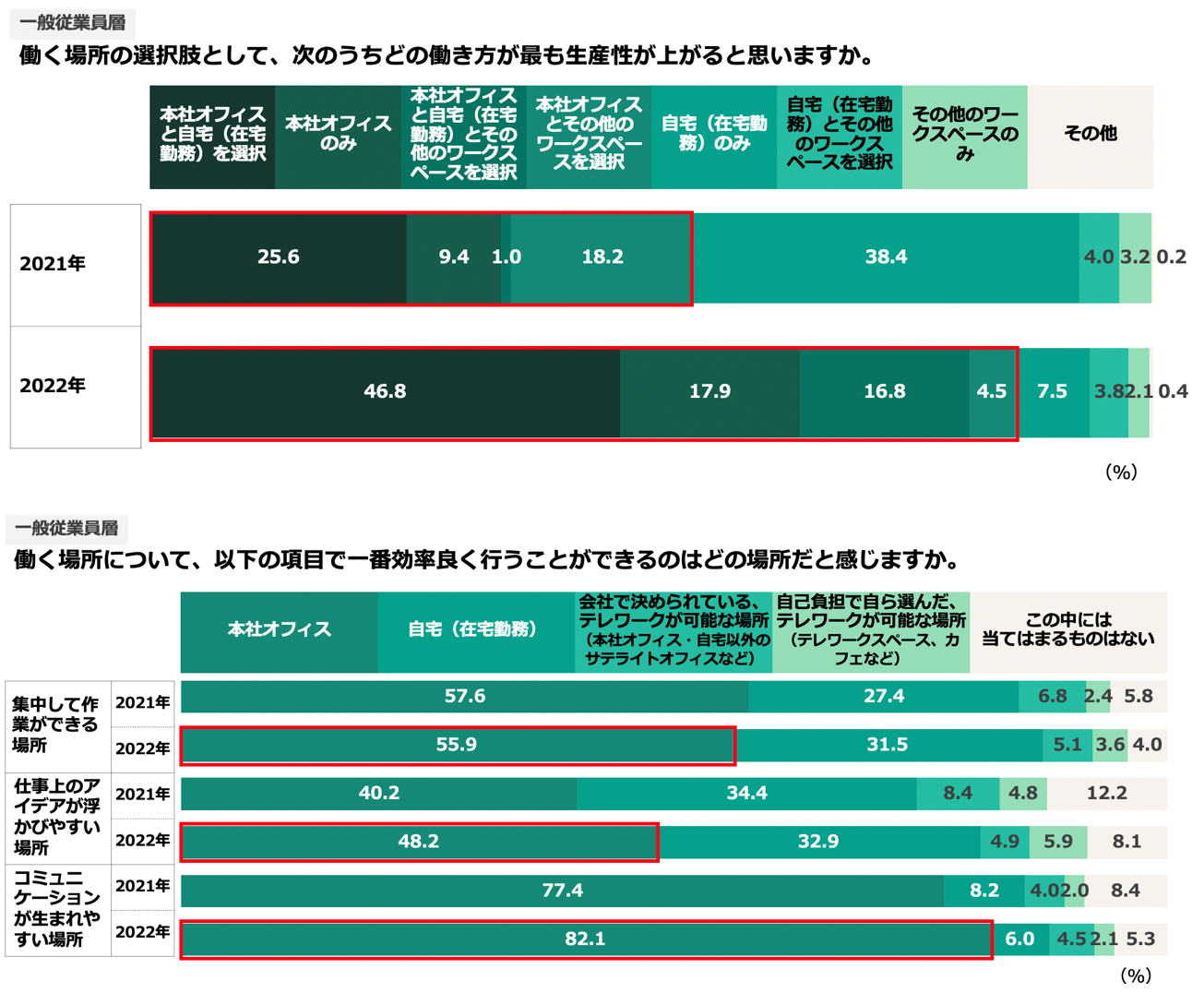 ハイブリッドワークが進む一方で、「本社オフィス」が「集中して作業ができる場所」「仕事上のアイデアが浮かびやすい場所」「コミュニケーションが生まれやすい場所」の3項目において1位にランクイン