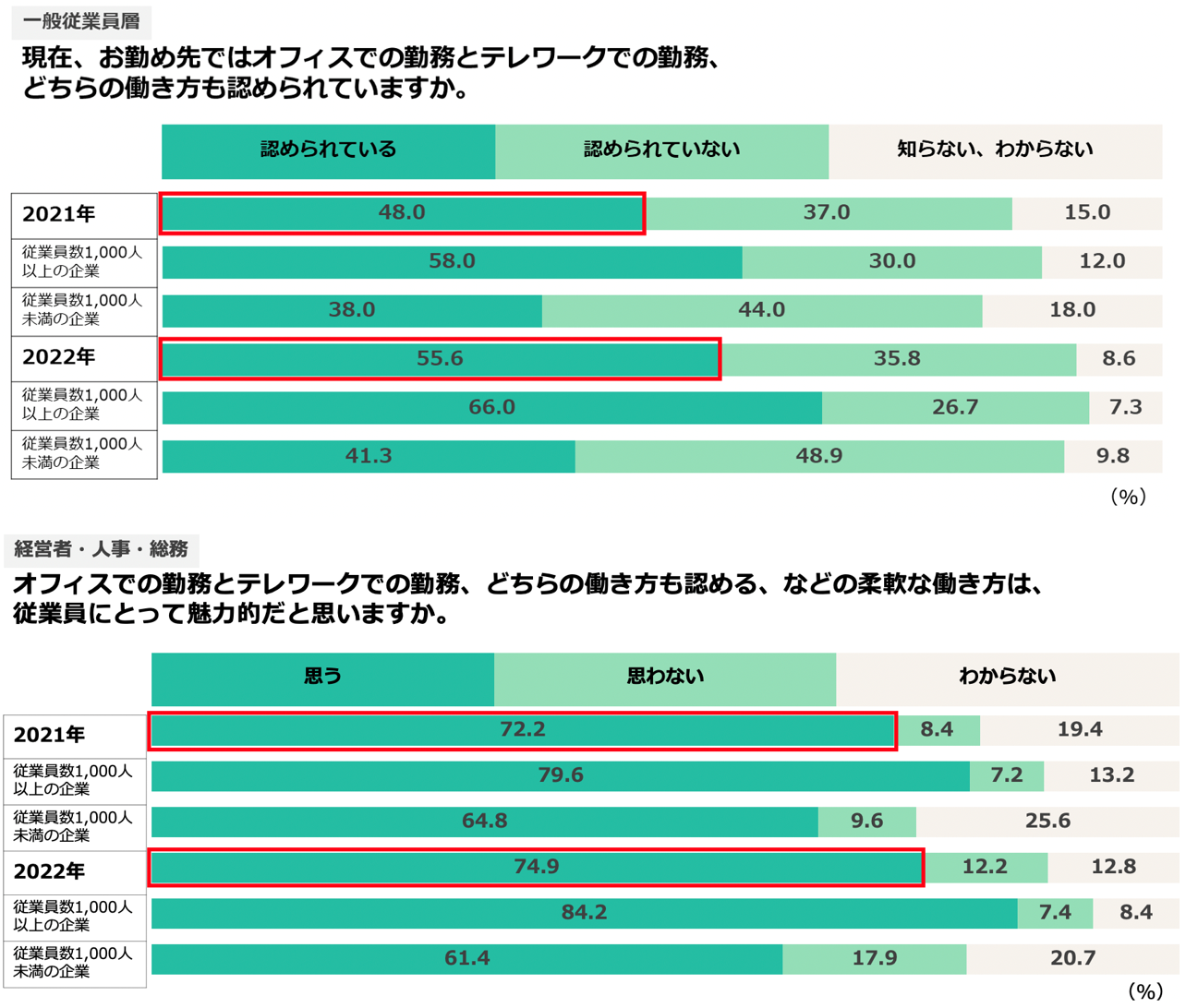 1. 一般従業員のうち、「オフィス勤務とテレワーク勤務の両方が認められている人」は、昨年(48.0%)より増加し55.6%。従業員数1,000人以上の企業で働く一般従業員では66%、従業員数1,000人未満の企業で働く一般従業員では41.3%という結果。 従業員数の多い企業の方が働き方の柔軟性が認められている。また、経営者層においては、「オフィスでの勤務とテレワークでの勤務どちらの働き方も認める」などの柔軟な働き方が、従業員にとって魅力的だと思うという回答が74.9%に達した。