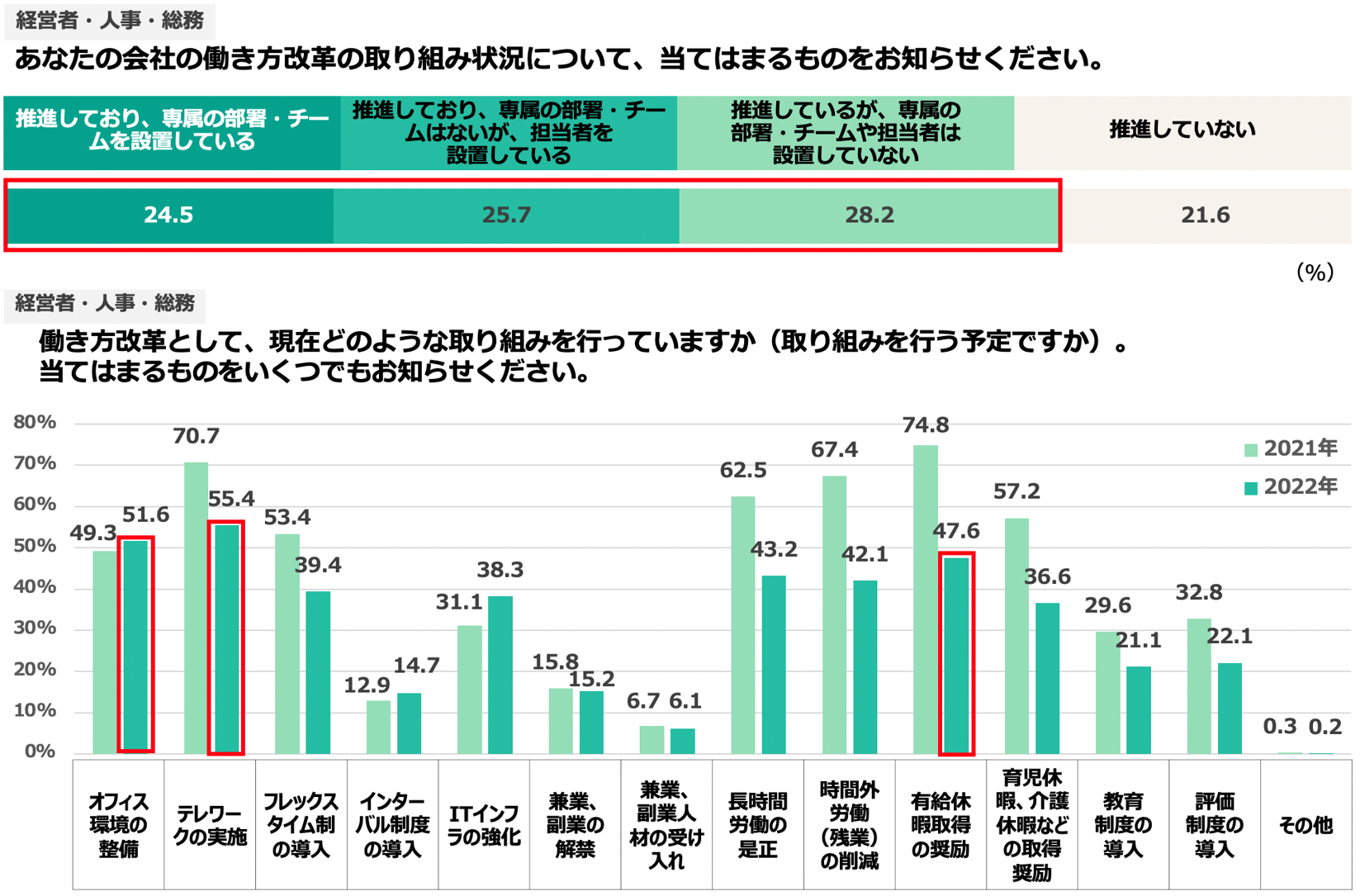 6. 経営者層の約8割(78.4%)が働き方改革を「推進している」と回答。働き方改革の取り組みトップ3は、「テレワークの実施(55.4%)」「オフィス環境の整備(51.6%)」「有給休暇の取得の奨励(47.6%)」。従業員が働き方を選択できる環境づくりを企業側も推進している傾向にある。今後、より柔軟な働き方が実現するための制度化、ツールの導入を進めていくことが重要であることが伺える。