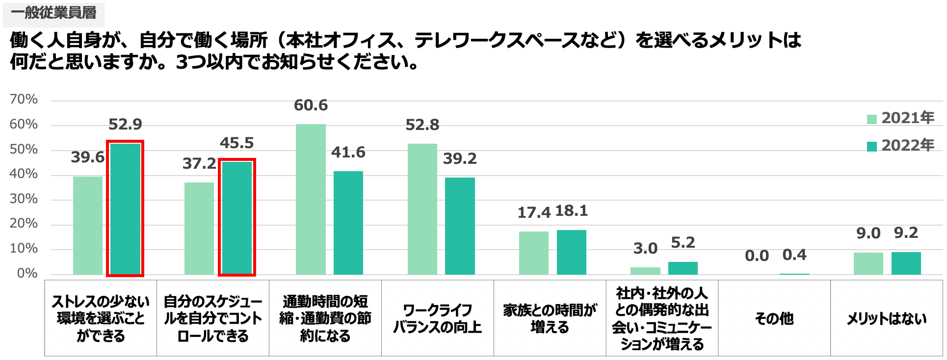 10. 一般従業員にとって自分で働く場所を選ぶことができるメリットは「ストレスの少ない環境を選ぶことができる(52.9%)」と回答した人が最多。昨年トップ回答だった「通勤時間の短縮、通勤費の節約になる(60.6%)」から変化。2位「自分のスケジュールを自分でコントロールできる(45.5%)、3位に「通勤時間の短縮、通勤費の節約になる(41.6%)」。心身の負担が高まっていることから、ストレス対策として、多様な働き方の選択肢が求められていることが伺える。