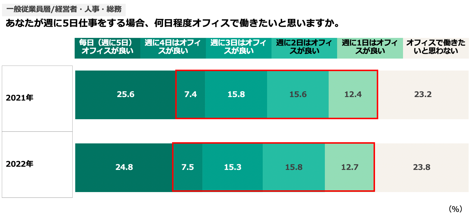 5. 昨年に引き続き、一般従業員で毎日オフィスに出社したい人、および出社したくない人がそれぞれ全体の約25%ずついるものの、2人に1人は「週に1〜4日はオフィスが良い」というハイブリッドワークを希望しており、「働き方を選択する」意向が定着しつつあることが伺える。