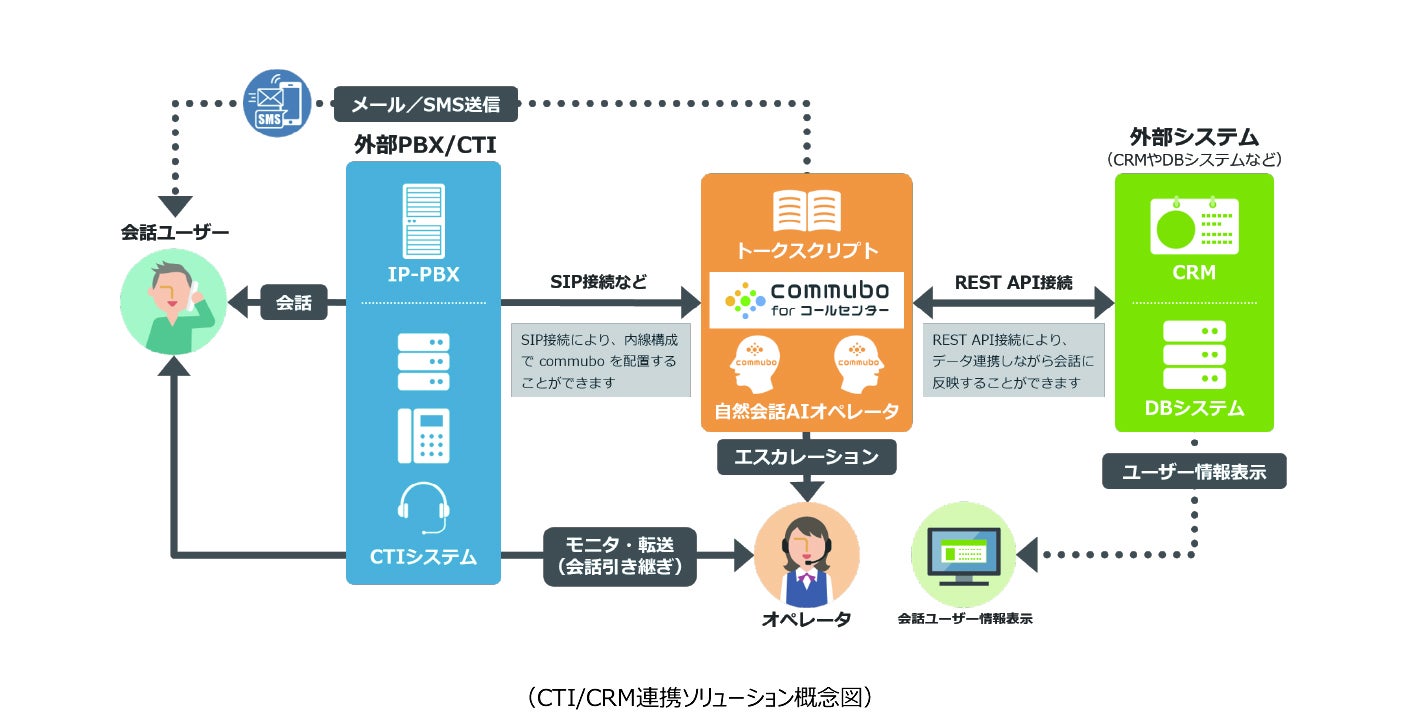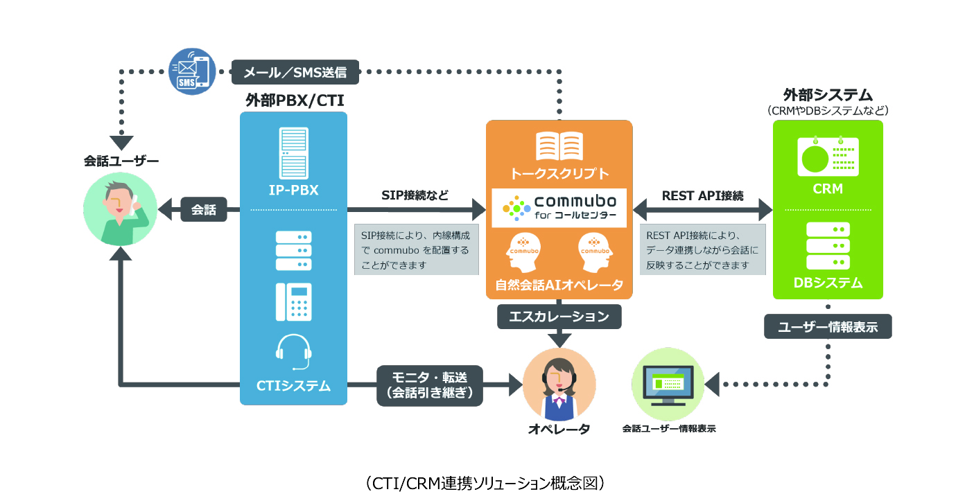 この「CTI/CRM連携ソリューション」では、ボイスボットの内線電話構成への配置と、顧客データベースへの効率的な情報送信を実現します。具体的には、コールセンター部門で多く使われている電話系CTI*製品との連携において、IP電話システムの標準プロトコル「SIP*」によって直接的に電話接続することで、ボイスボットを内線構成に組み込むことが可能ですます。また、CRM製品との連携では、commubo自体に備わっているデータアクセスAPIによって会話フレーズ毎にデータ連携を実現し、かつ予め検証済みの状態で企業の方々に提供いたします。