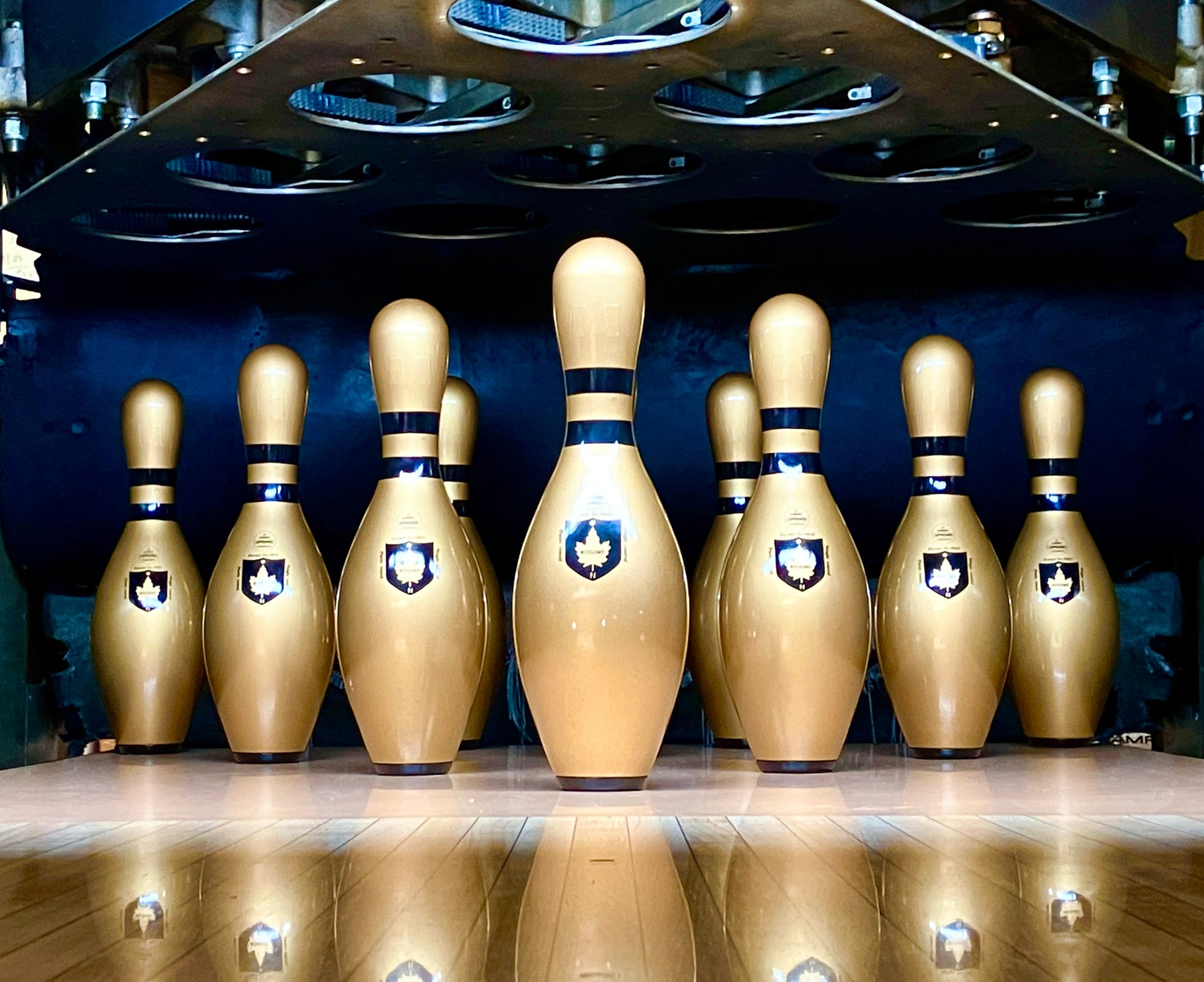 (3)アメリカのプロトーナメントPBAの決勝戦で使用された特別な公式ゴールドピンを使用します。黄金に輝くピンでゴージャスな雰囲気を演出します。黄金の色味が分かりやすいように照明をLEDに変更しました。
