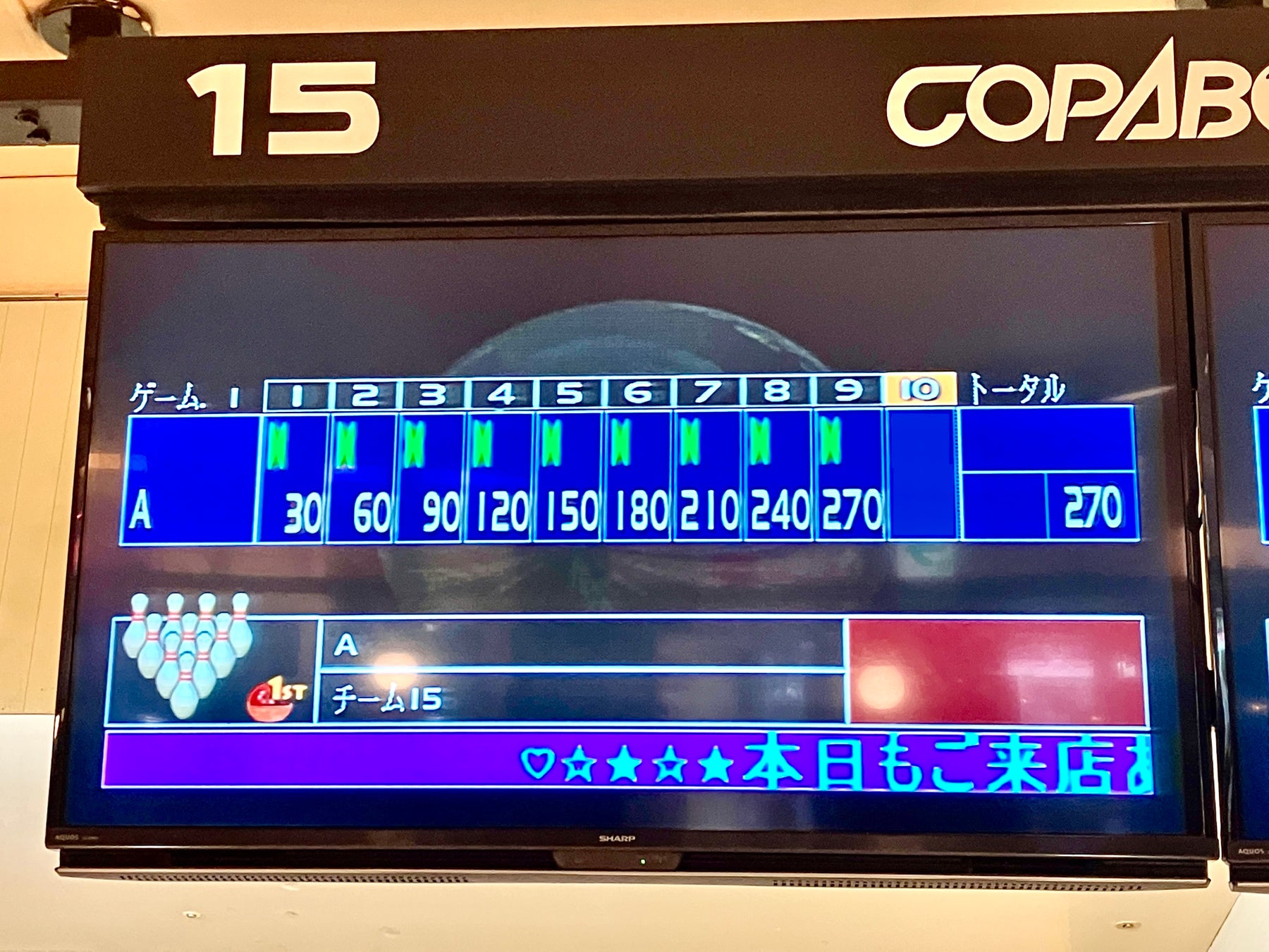 (1)パーフェクトゲーム達成直前の10フレーム目、スコア270からスタートします。3回ストライクを出せるとパーフェクト達成です。