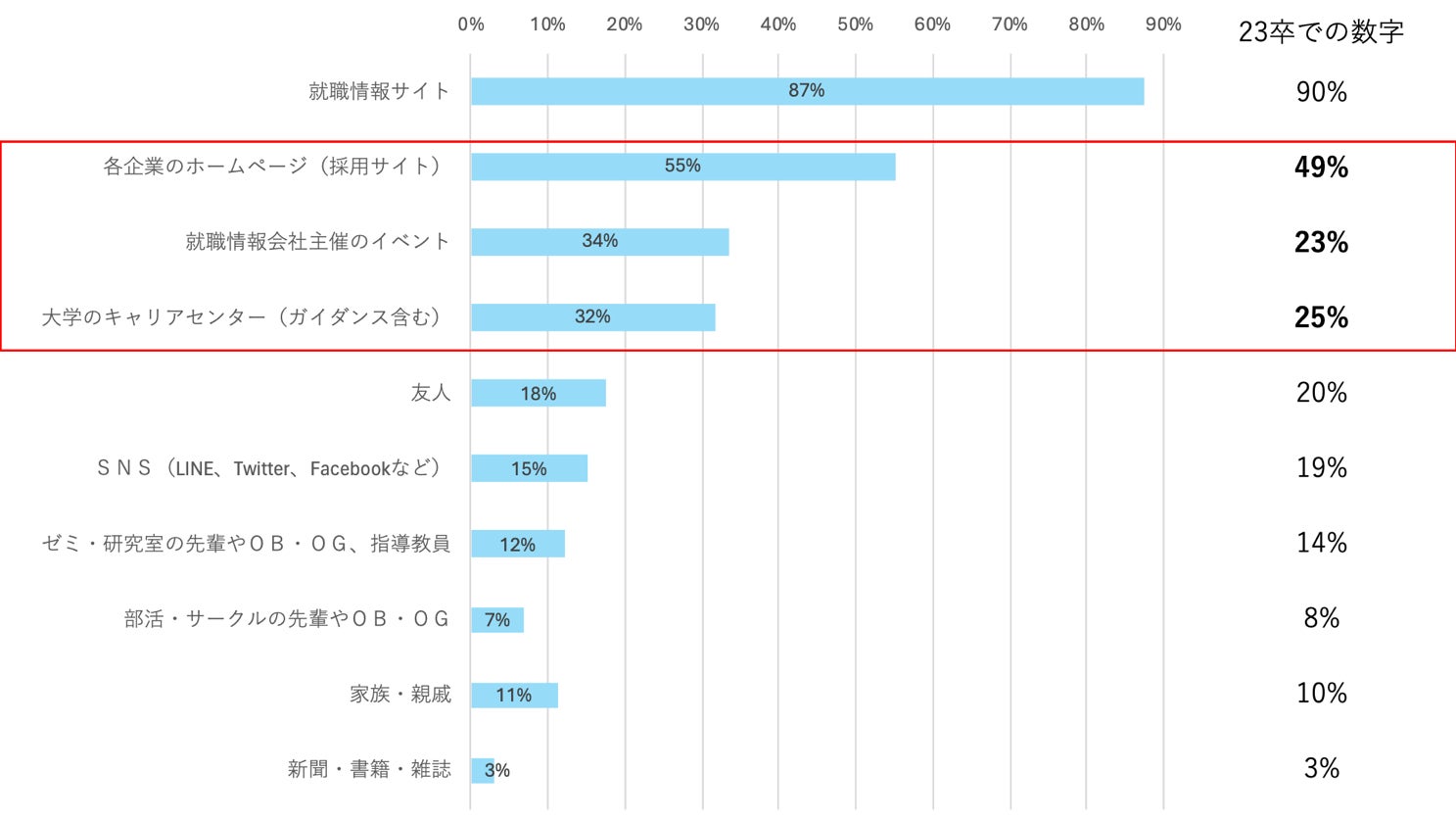 「就職情報サイト」を利用して情報収集を行う学生が圧倒的に多く、次いで「各企業のホームページ(採用サイト)」を活用する学生も過半数を超えていた。学生に情報を届けるためには、就職情報サイトの活用だけではなく、自社のホームページでのコンテンツ発信もより一層必要となっている。また2023年卒者と比較すると「就職情報会社主催のイベント」から情報を得る学生の割合が増加し、大規模イベントの実施ができなかった新型コロナウイルスによる就職活動への影響が限定的となっていることが考えられる。