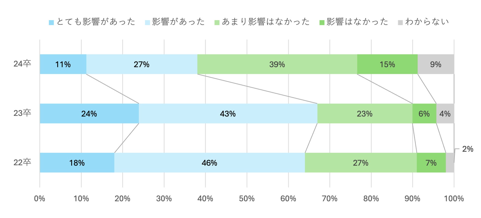 2024年卒者については、1社の内定で就職活動を終えた割合が58%、2社以上の内定を獲得した学生が42%となった。2023年卒者よりも若干複数内定の割合が減少したが、半数近い学生が複数の内定を持ち、そこから一つの就職先を選択している。一方で、1社の内定で就職活動を終えた割合が増加していることから、学生がエントリー企業をより慎重に選択し、選考に進む企業もより焦点を絞って1社1社に集中して就職活動を行っていると考えられる。