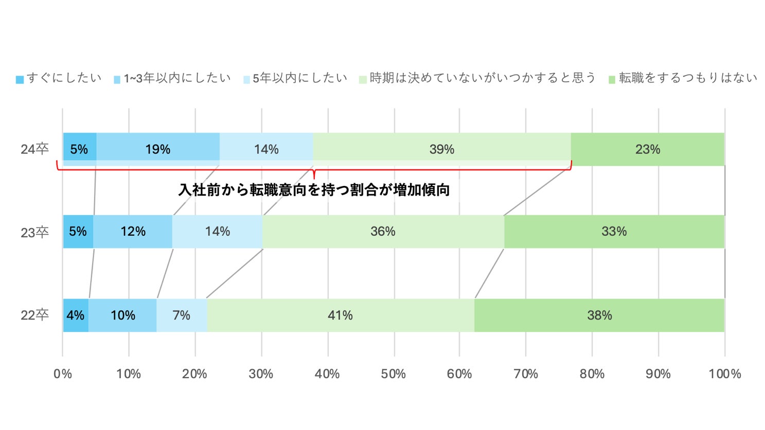 今後の転職活動に対する意向については、「1〜3年以内にしたい」「時期は決めていないがいつかすると思う」の割合が増加し、入社前から転職意向を持つ学生の割合が過去3年間で最も多くなった。この2つの結果から「就職先には満足しているが、今後もその企業で働き続けることを希望していない」という傾向があることを示している。企業は、若い世代の働くことへの価値観が多様化していることを踏まえて、多様な働き方への対応も求められている(例:フレックスタイム制やテレワーク、兼業・副業等)。