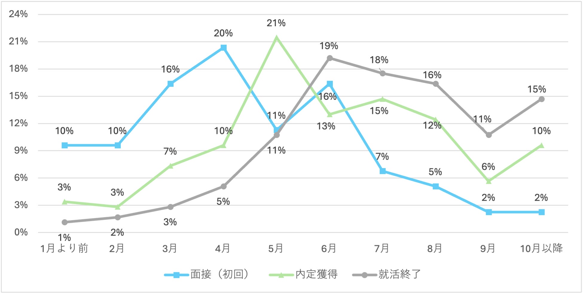 3年生3月までに面接を受けた割合は36%(1月より前:10%、2月:10%、3月:16%)であり、同時期に内定を獲得している割合は14%(1月より前:3%、2月:3%、3月:7%)だった。しかし、この3月時点で就職活動を終了させた学生は少なく、過半数の学生は、4年生7月ごろまで就職活動を継続していることがわかった。内定獲得後にも就職活動を続ける学生が多く、企業は選考終了後の学生へのフォロー(内定フォロー)も重要となっていると考えられる。