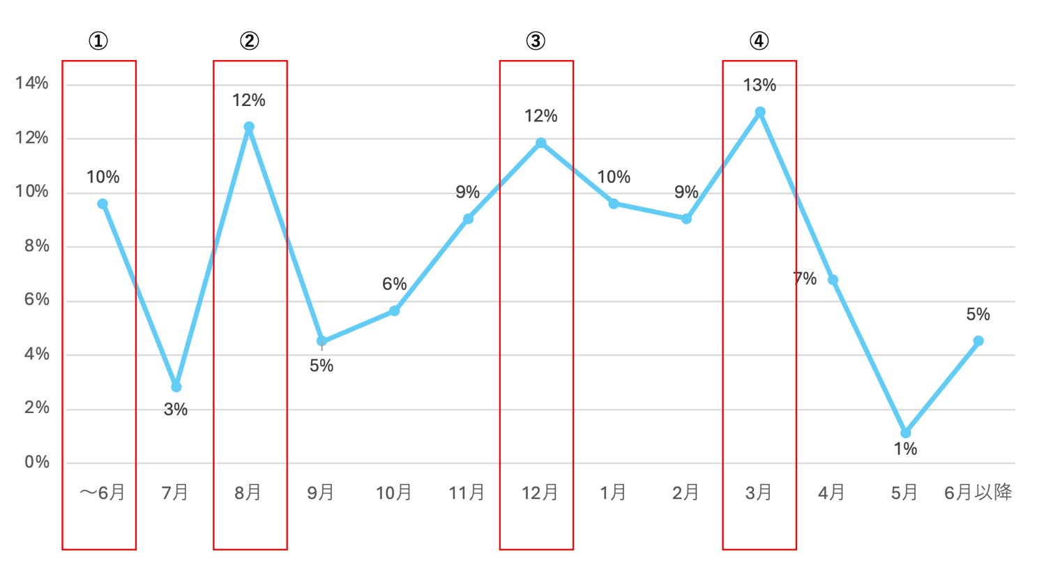 就職活動の開始時期には4つの波があることがわかった(①「3年生6月より前に開始」、②「3年生8月(夏休み)に開始」、③「3年生12月(冬休み)に開始」、④「3年生3月に開始」)。②「3年生8月(夏休み)に開始」の時点でも、すでに4人に1人が就職活動を開始しており、早期化の傾向がみられる。採用につなげるために、早期段階から学生と接点を持つことが重要になっている。