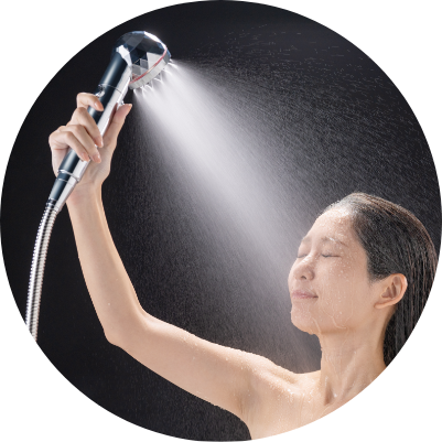 洗髪や体の洗い流しなど、幅広く使える基本の水流モードです。水の出方を編んだ網のような水流にする最新の散水技術を採用し、水が体に当たる面積を広くすることで、効率のよい洗い流しが可能です。また、シャワーヘッドと身体の距離を離すと、肌に対して水が斜めに当たるように設計されており、肌への刺激を軽減します。