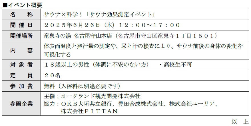 本イベントは、藤田医科大学 医療科学部 医療准教授の西垣 孝行 氏の監修のもと、オークランド観光開発が運営する「竜泉寺の湯 名古屋守山本店」において、6月26日(木)に開催されます。イベント参加者は、豊田合成が連携するスタートアップのユーリアや、神戸発のディープテック・スタートアップであるPITTANが開発した検査キットなどにより、サウナ前後の身体の変化を計測し、そこで得られた画像やデータを通じて、サウナの効果や身体への影響についての理解を深めます。参加者が得る新たな気づきや発見は、サウナに対する価値観の変化を促し、健康意識の向上やサウナ施設の利用促進につながることが期待されるため、各社は、今後もこうした取り組みを継続的に実施し、健康増進を促す新たなサービスの開発を目指します。