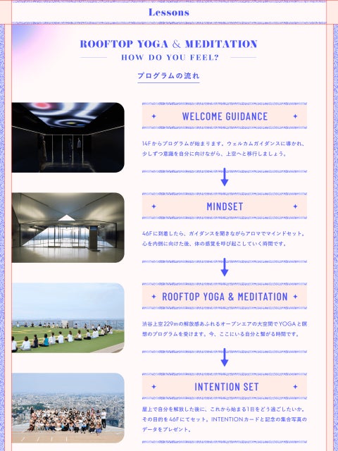 「HOW DO YOU FEEL?」をテーマに、渋谷最高峰の解放感あふれる大空間で自分の内側に意識を向け、今の自分の感覚に気づき、今、ここにいる自分と繋がる時間を提案します。