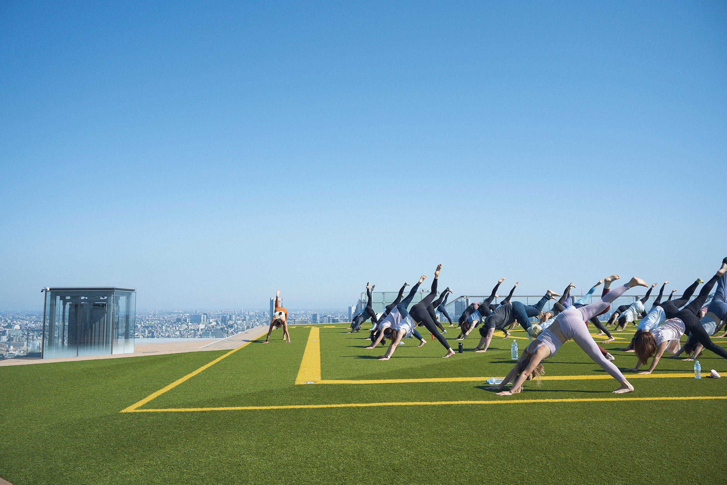 ・ヨガマットの持ち込みは不可です。ヘリポートの人工芝の上での実施となります。