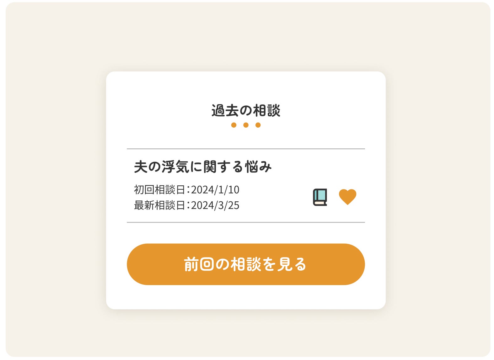 すべての会話は自動的に保存され、いつでも過去の対話を振り返ることができます。忙しい中で相談を中断しても、前回の続きから話を再開できるので、安心して深い話を続けることができます。
