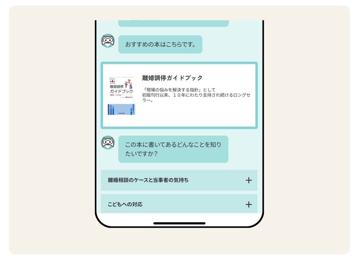 カウンセリングで相談し「お悩みをまとめる」ボタンで整理された内容に対して、AI司書が、その状況や問題に最適な日本加除出版の書籍を推薦し、要約してポイントを案内してくれます。