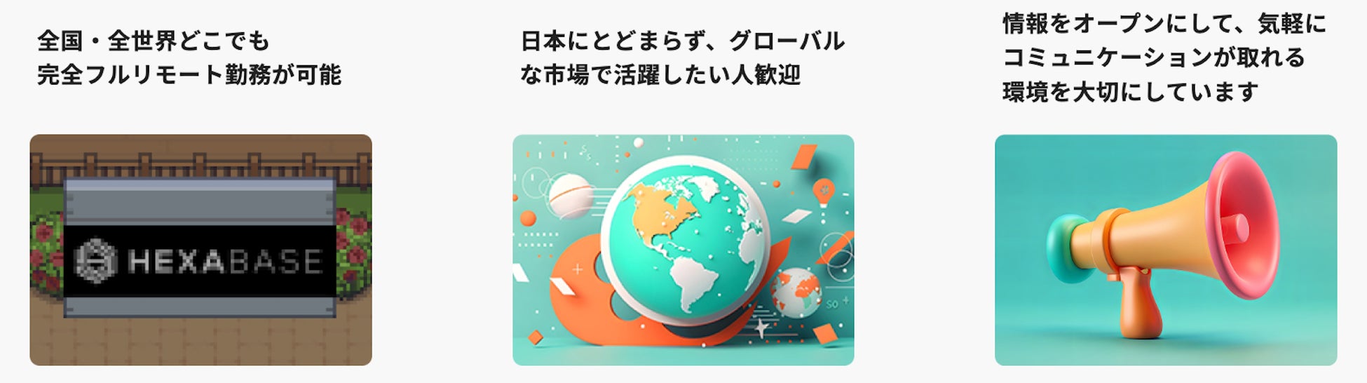 スタートアップ企業に求められる情熱とスピードを備え、自分に任されている分野以外においても実行能力がある、そんなメンバーがHexabaseには集まっています。 常にフェアでオープンなコミュニケーションを重視し、お互いの違いを受け入れ、才能を認め、積極的なスキルアップをサポートする環境づくりが不可欠であると考えており、柔軟で自由な働き方を実現しています。