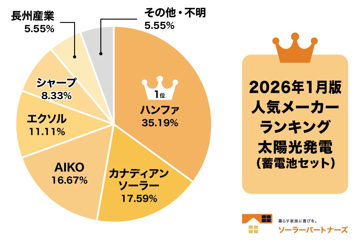 太陽光発電と蓄電池の見積もりサイト「ソーラーパートナーズ」を運営する株式会社ソーラーパートナーズ(本社:東京都新宿区、代表取締役:中嶋明洋)は、2026年1月の住宅用「太陽光発電の人気メーカーランキング」を発表しました。