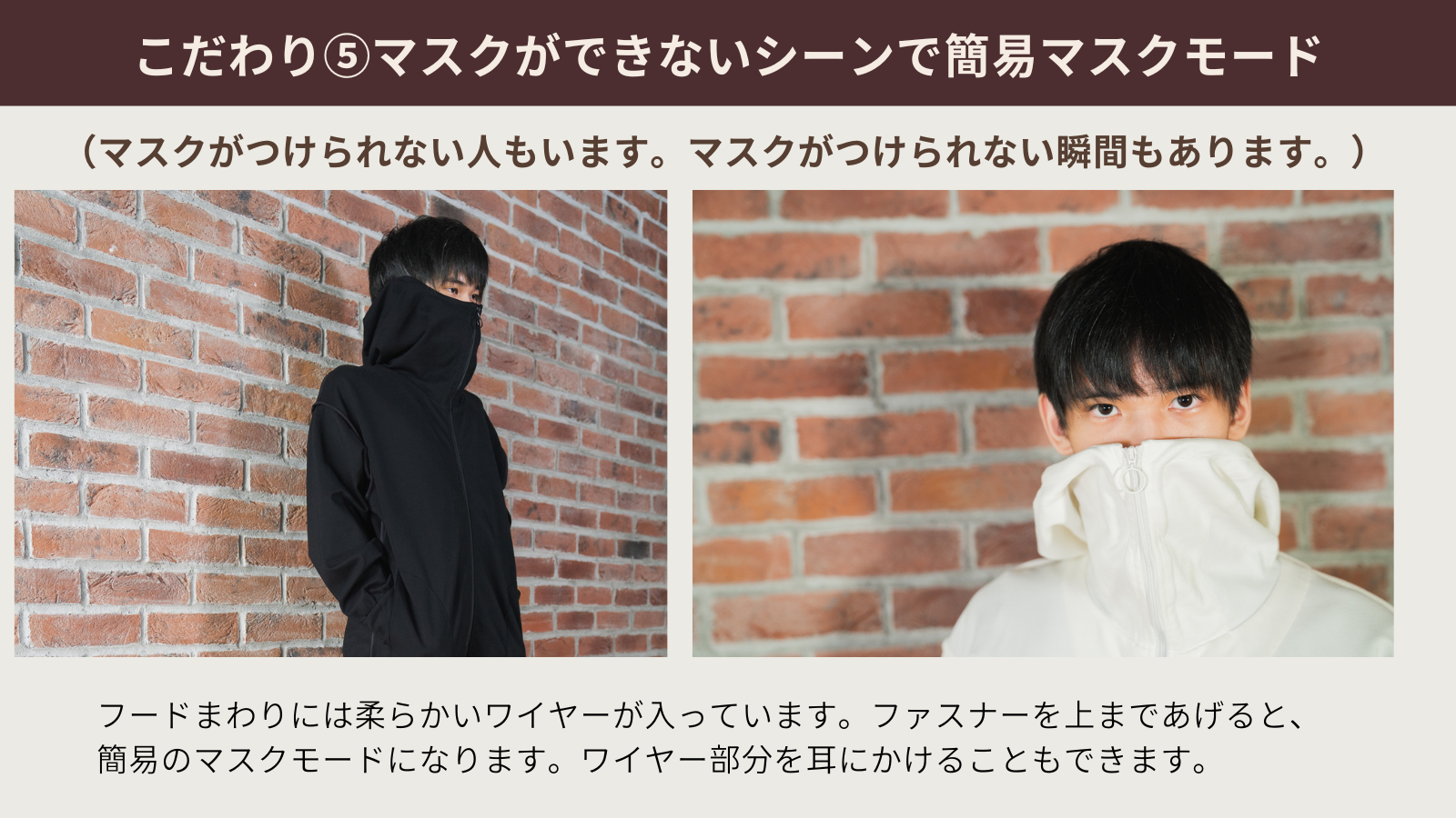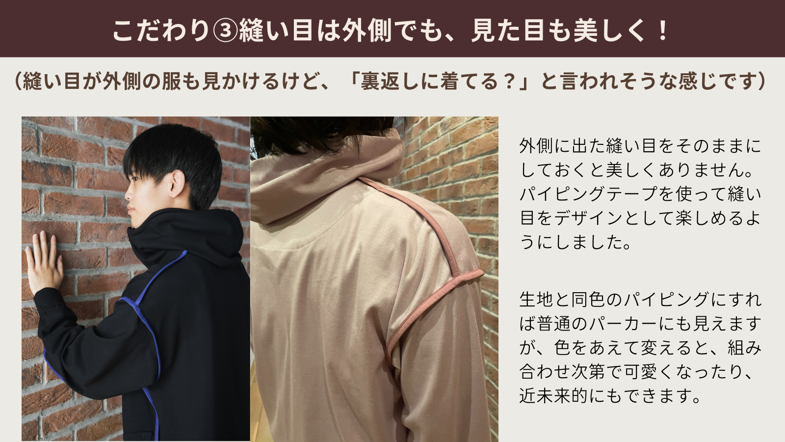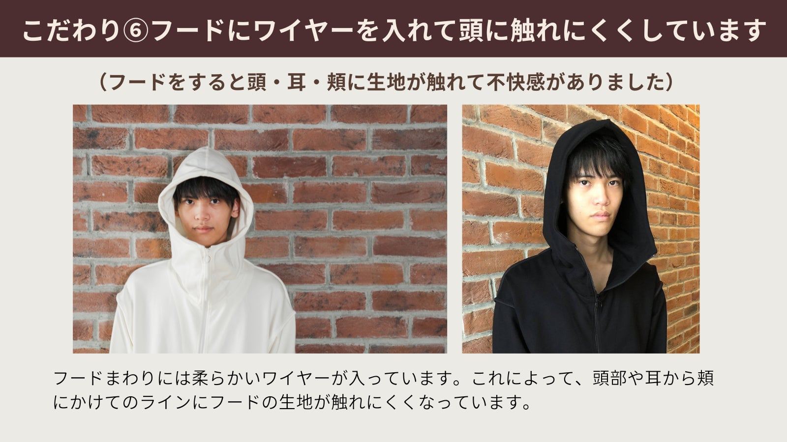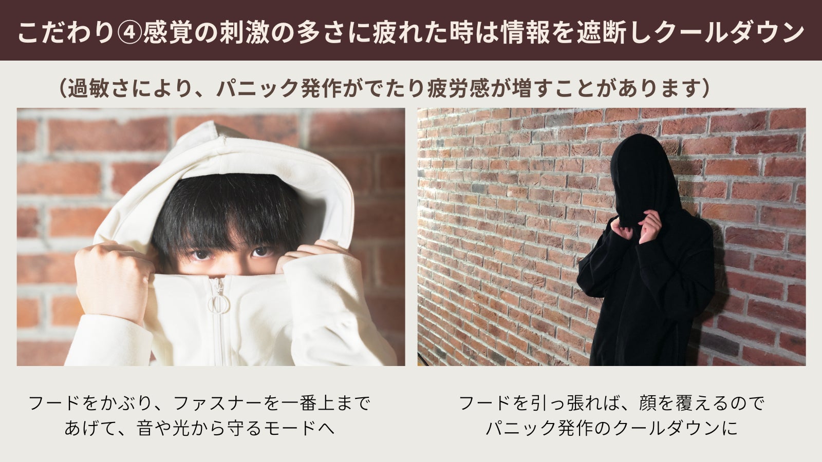 感覚過敏で服が着られなかった方にやさしい作りをしているパーカーです。また、音や光が多いこの社会で疲れた時に自分を守ってカームダウン・クールダウンできるパーカーです。多くの人に知ってもらって、袖を通してもらいたいです。