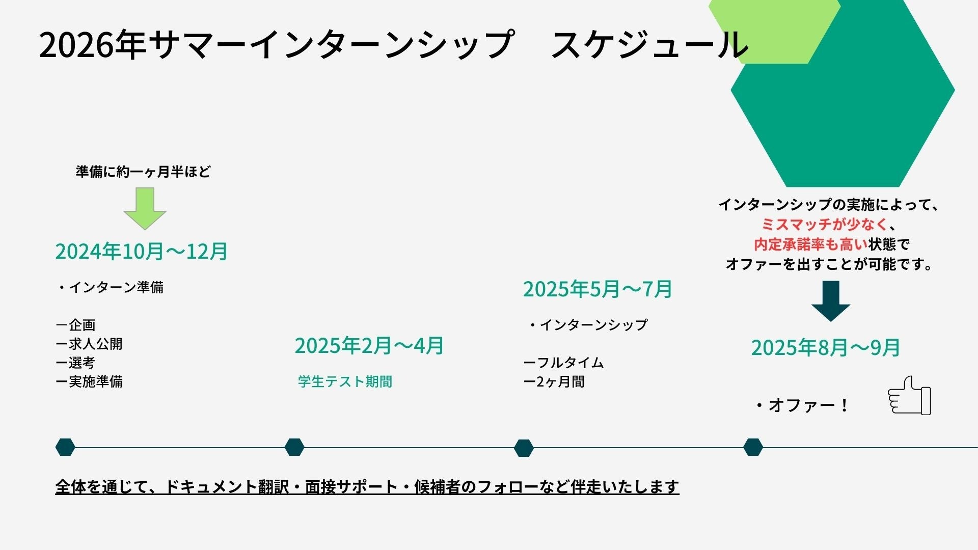 なお、インターンシップ期間を経た企業からの内定提示率は46.7%、受諾率は85.7%(昨年度サマーインターンシップ実績)と国内理系人材内定提示・受託率と比較しても非常に高くなっています。