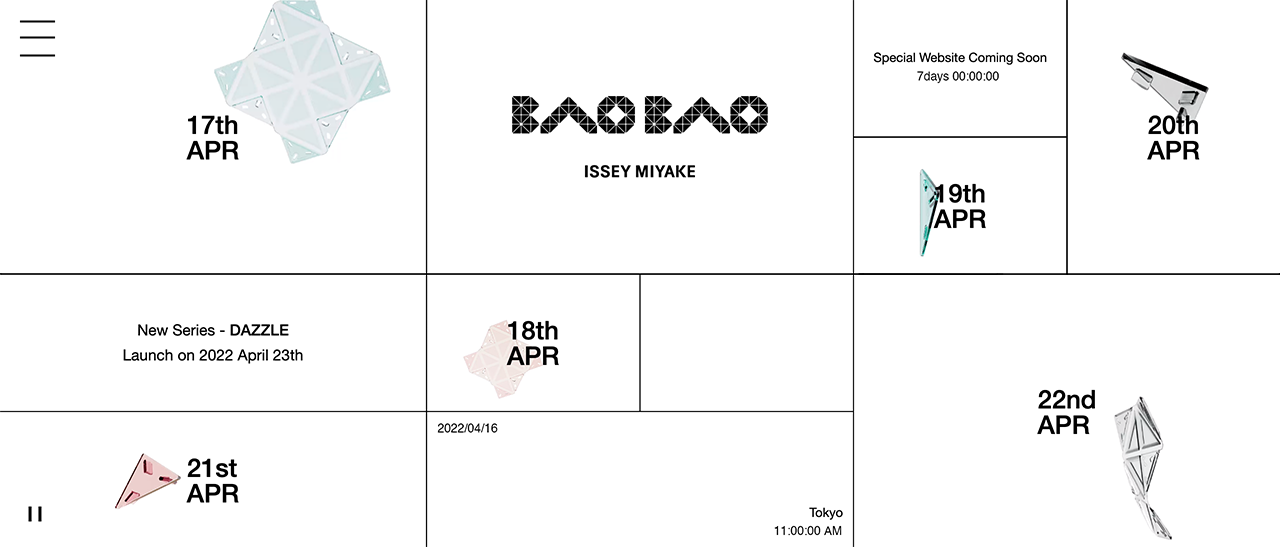 ピースを組み合わせ構成することで作り出す革新的なコンセプトと製法に基づて作られた「DAZZLE」の発表に先駆け、毎日少しづつ情報を発信し、やがてその全貌が分かるカウントダウンサイトを公開しました。