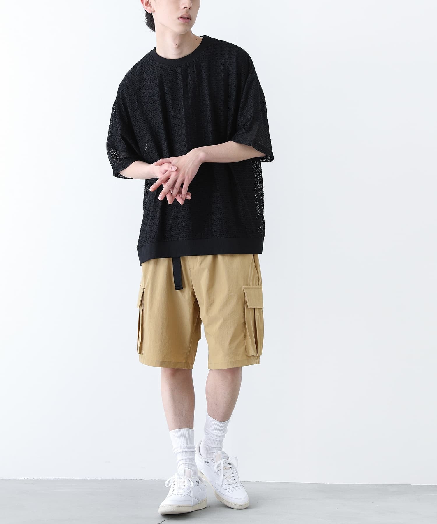 脇のカーゴポケットや、配色のベルトがアクセントになった、メンズのハーフカーゴパンツです。
