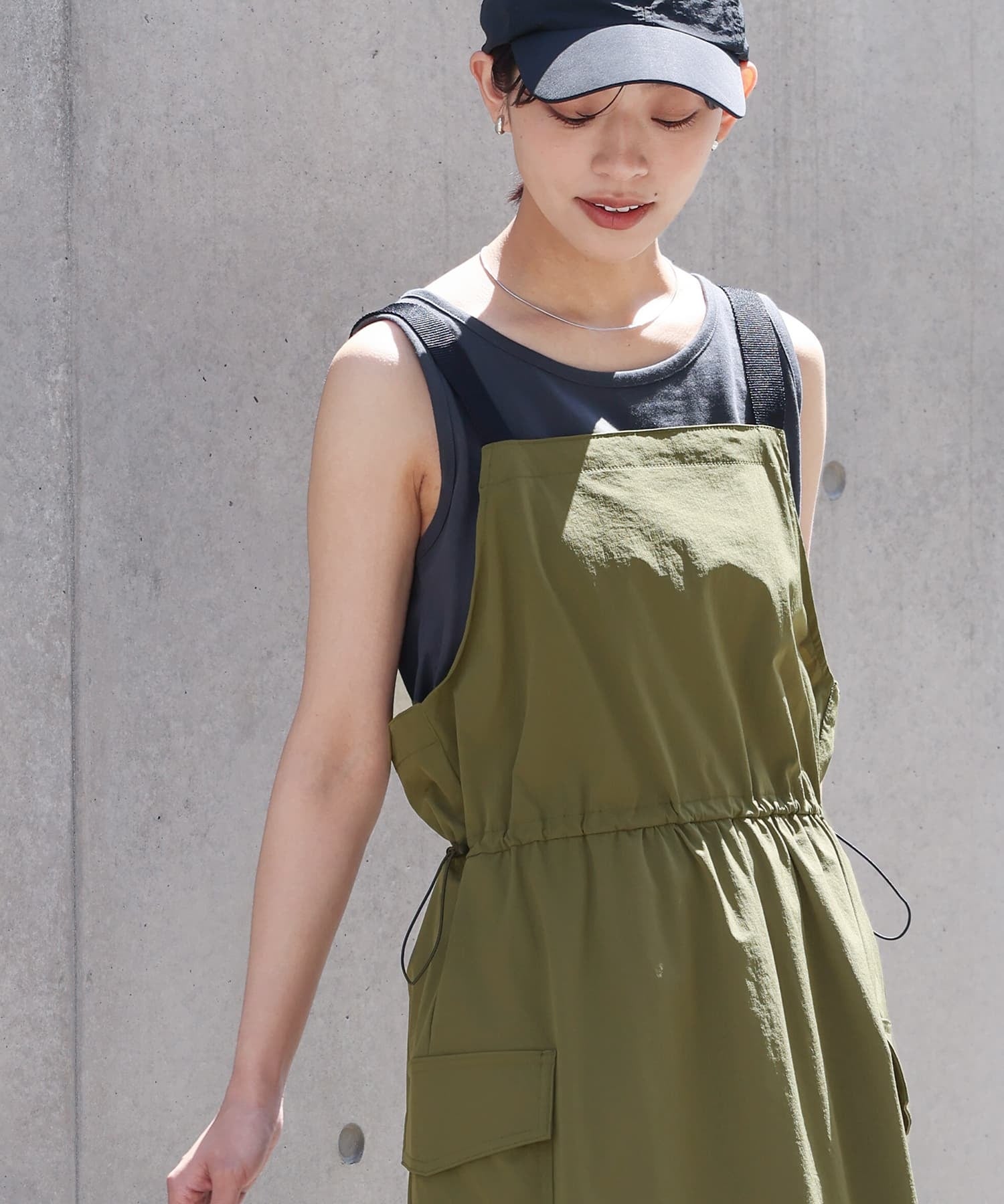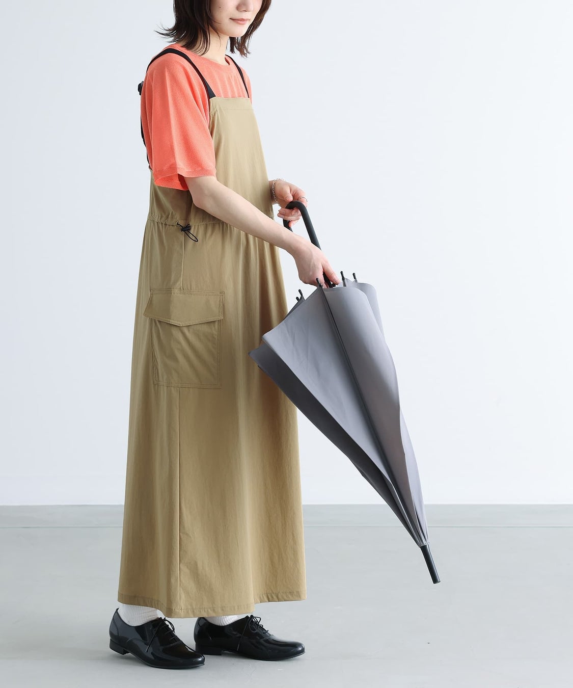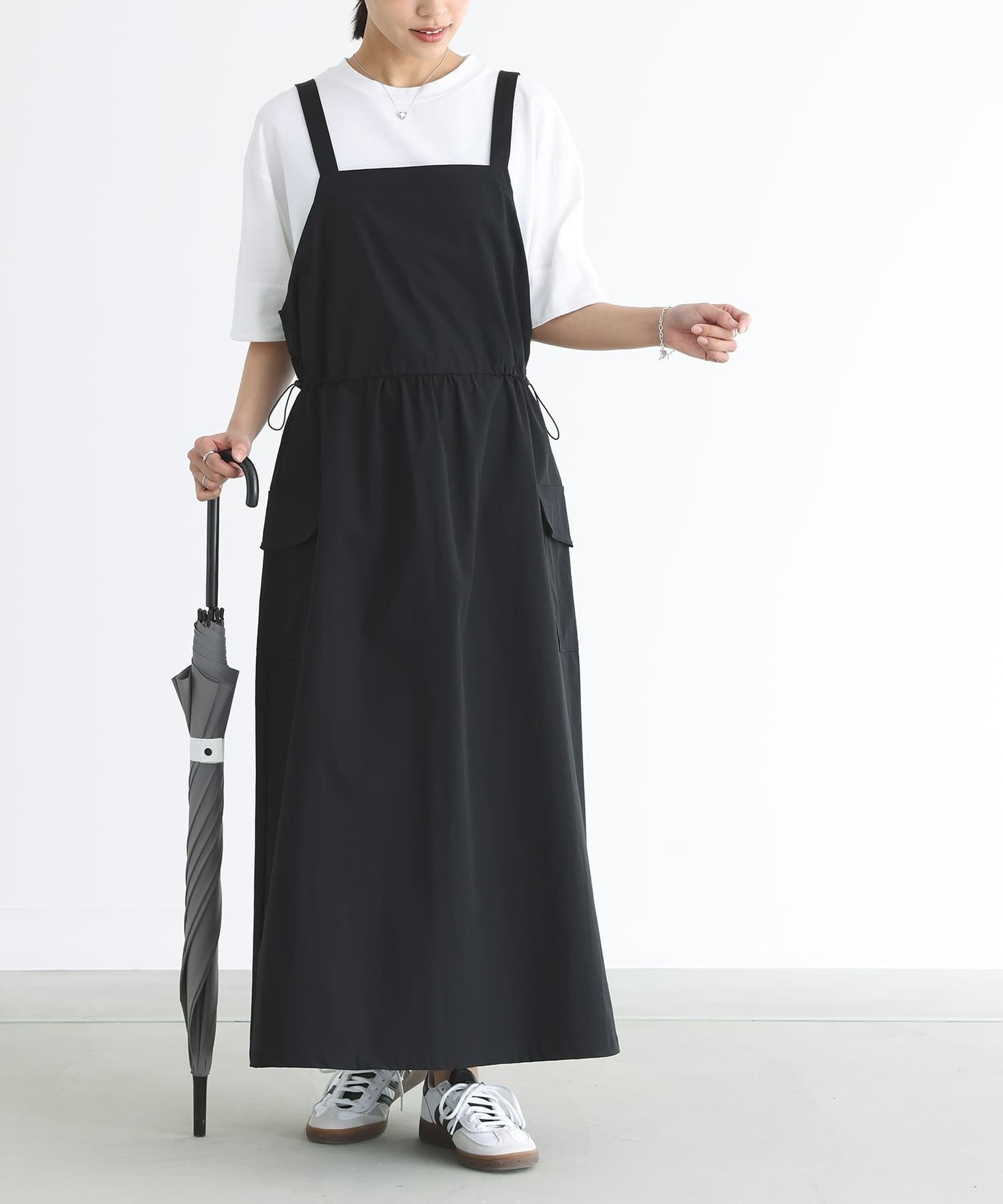 脇のカーゴポケットがポイントのジャンパースカートです。ウエストは絞ってギャザー分量を調節することができます。