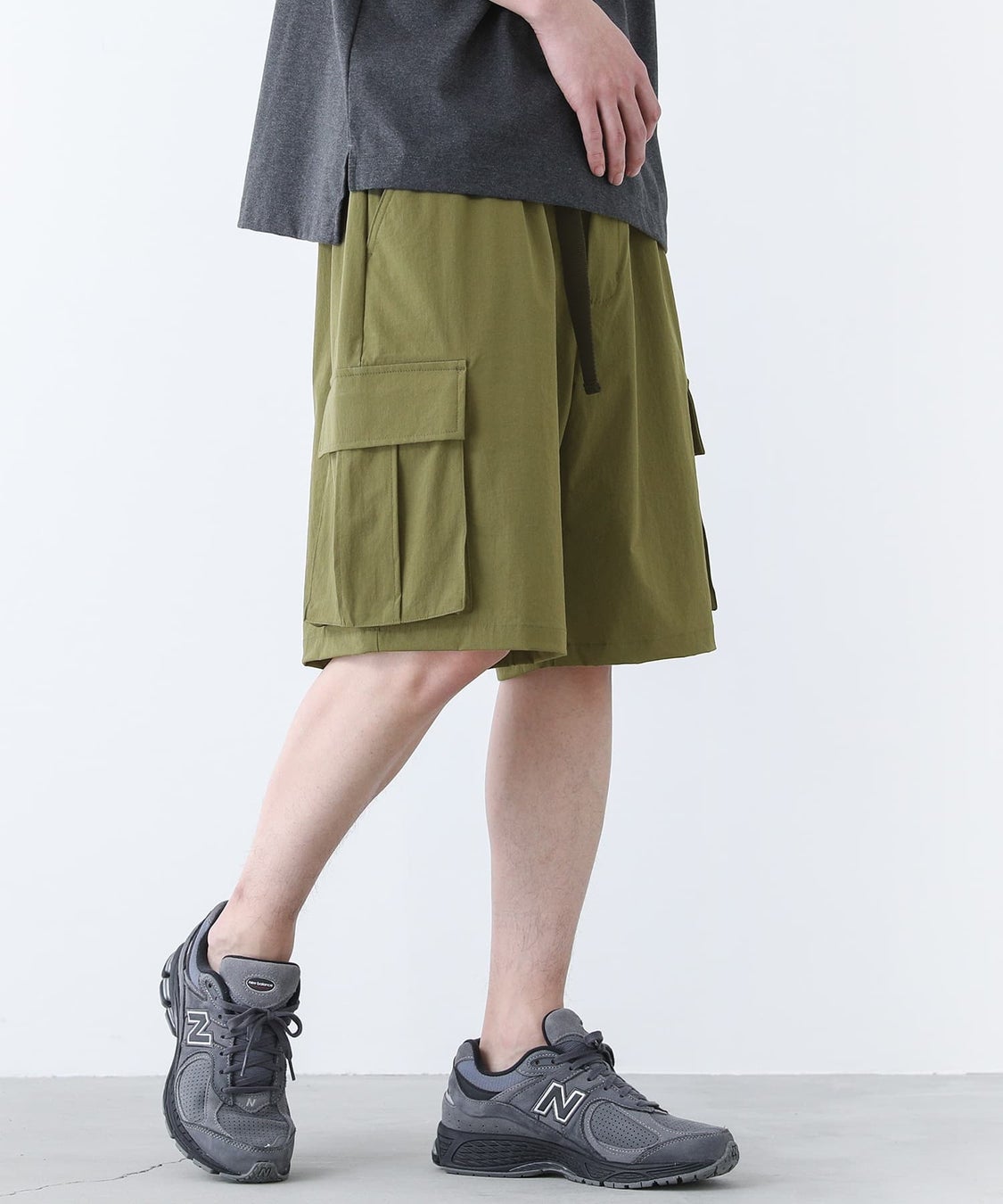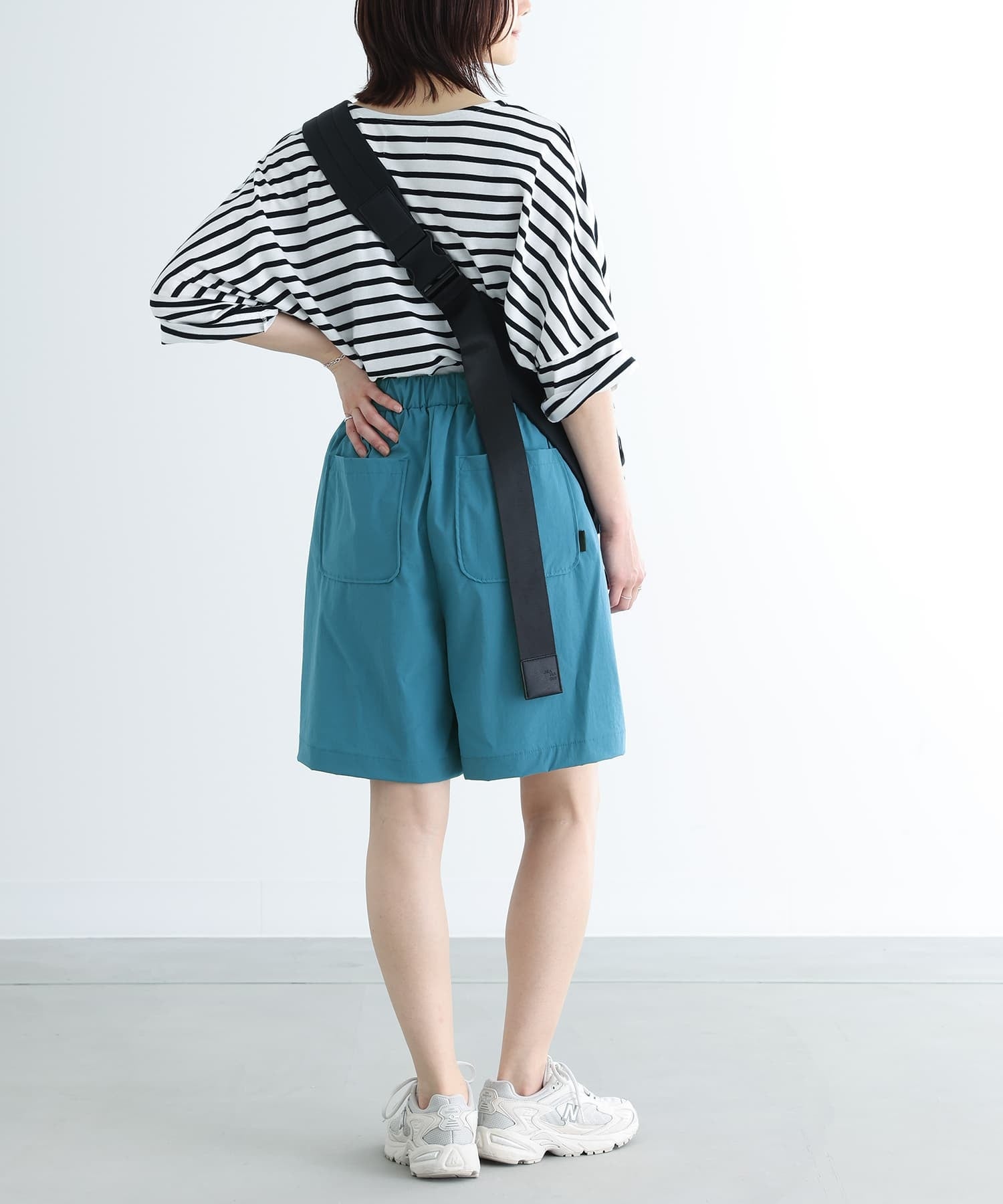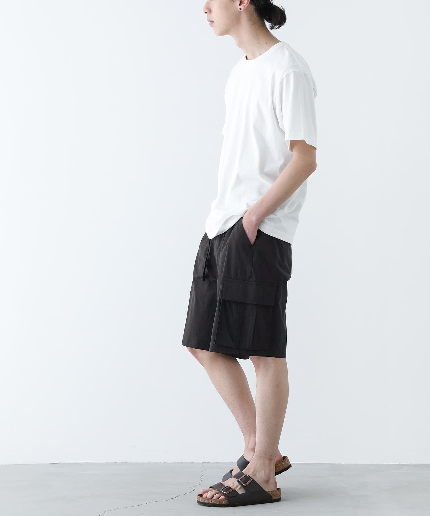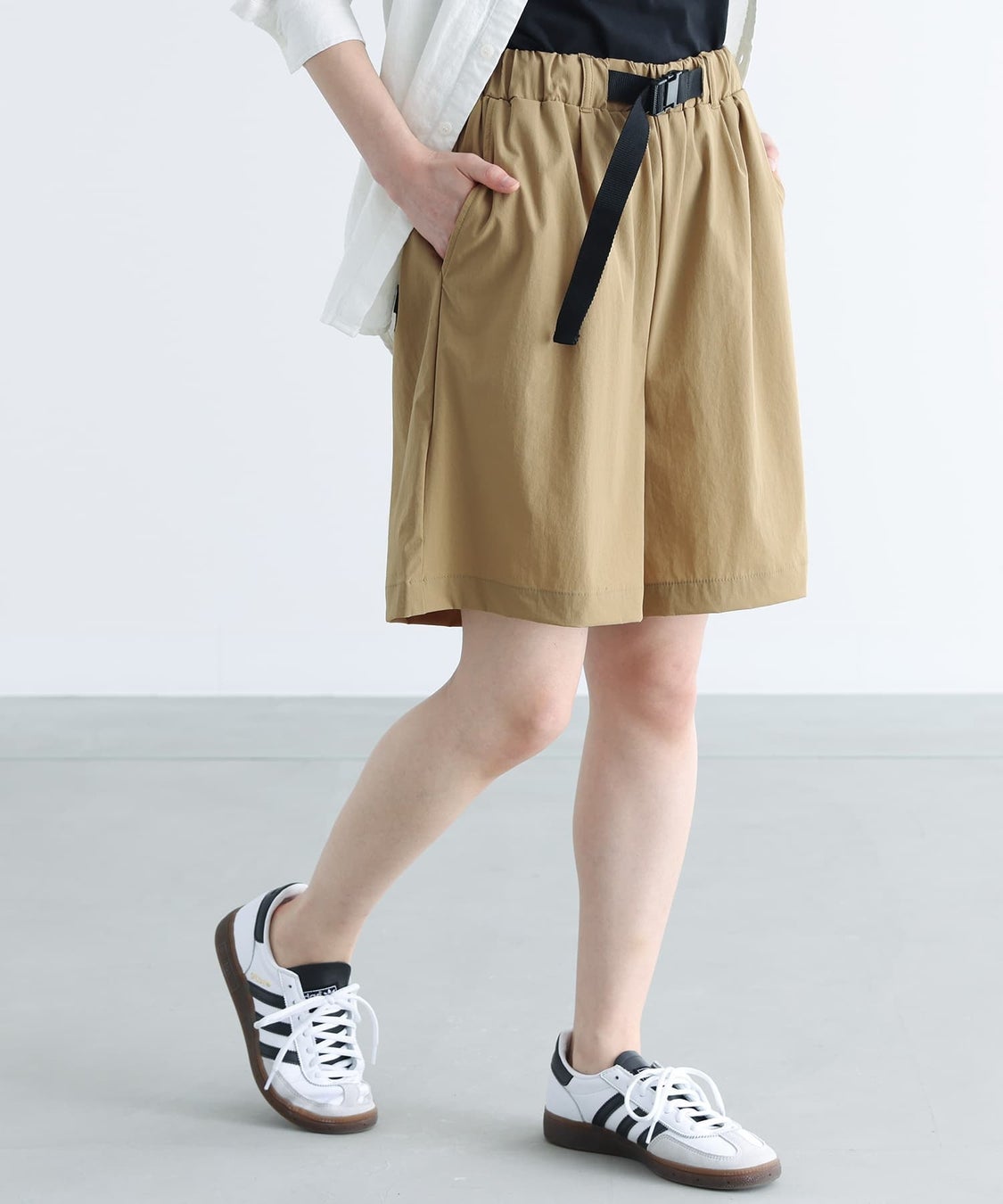 分量感のある膝丈デザインで大人でも気軽に穿けるハーフパンツとなっています。配色のベルトと後ろポケットに挟んだタブがアクセントになります。
