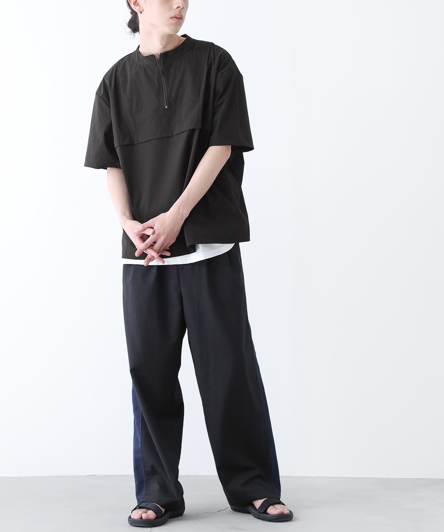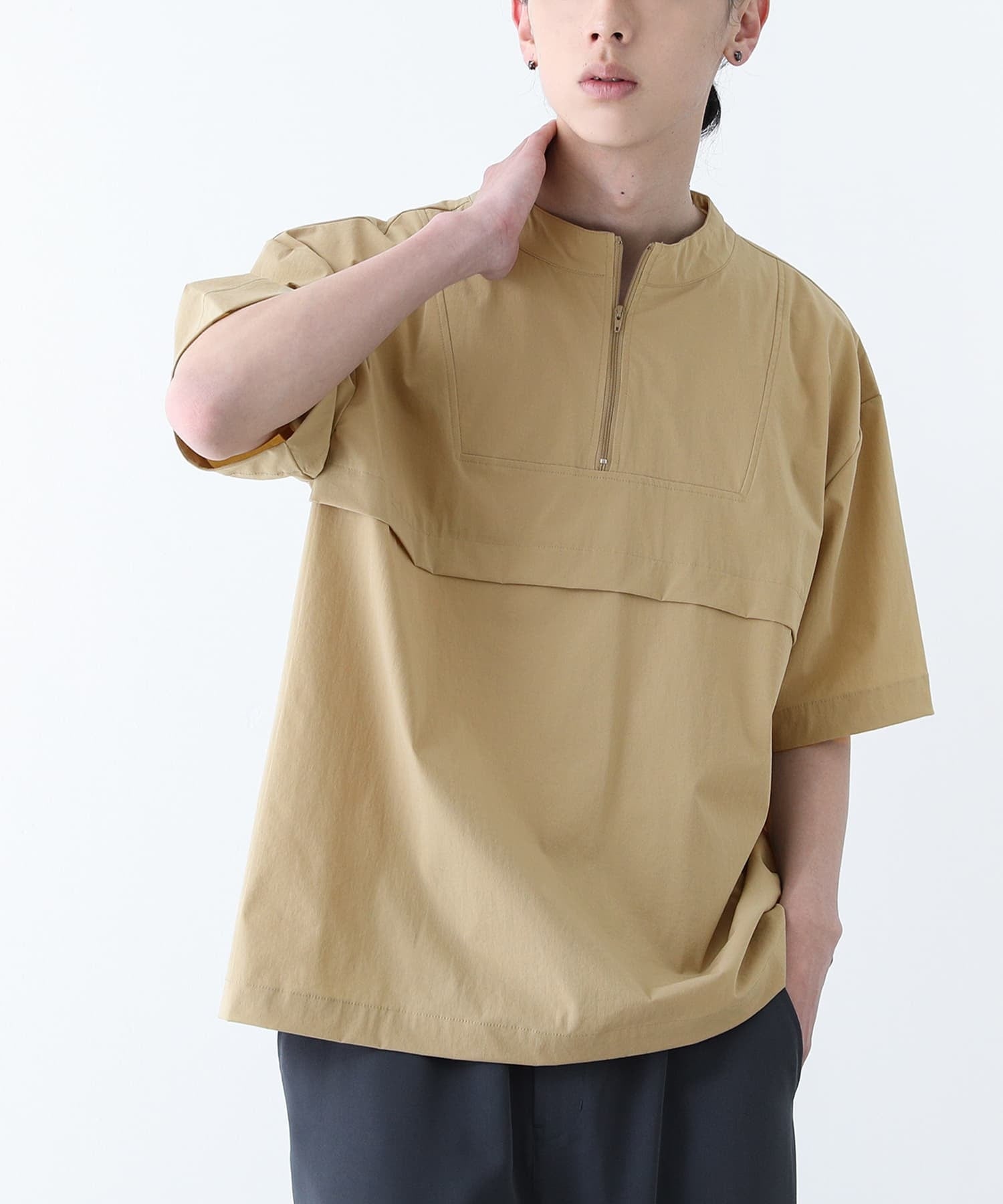 1枚でお洒落見えするデザイン性のあるメンズハーフジップトップス。身頃のタック切り替えがポイントです。