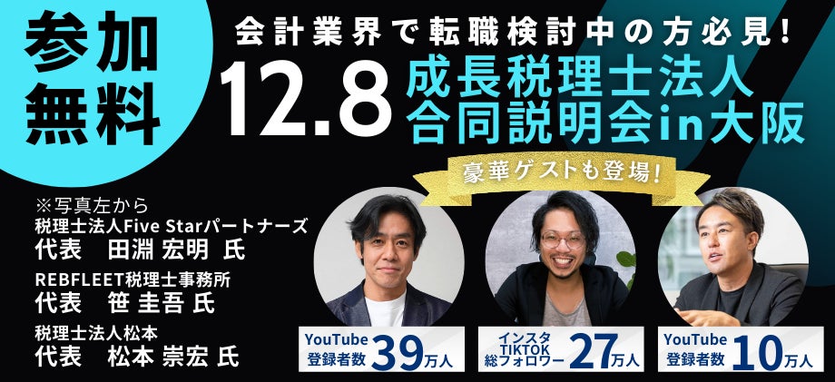 【参加無料】会計業界のリアルが分かる!12/8、急成長中の税理士法人が大阪に集結!
