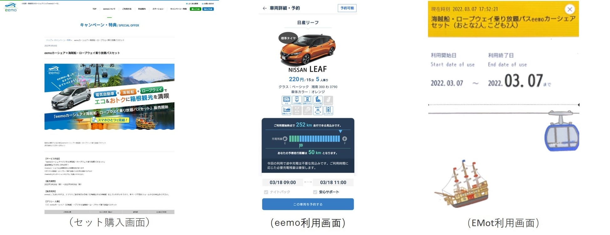 株式会社REXEV(本社:東京都千代田区、社長:渡部 健)、箱根観光船株式会社(本社:神奈川県小田原市、社長:岡本 裕之)、箱根ロープウェイ株式会社(本社:神奈川県小田原市、社長:飯田 直保志)と小田急電鉄株式会社(本社:東京都新宿区、社長:星野 晃司)は、2022年3月18日(金)から9月30日(金)まで、電気自動車カーシェアリング「eemo(イーモ)」のキャンペーンサイトとアプリ「eemo」にて、共同企画商品「eemoカーシェア+デジタル海賊船・ロープウェイ乗り放題パスセット」を販売します。