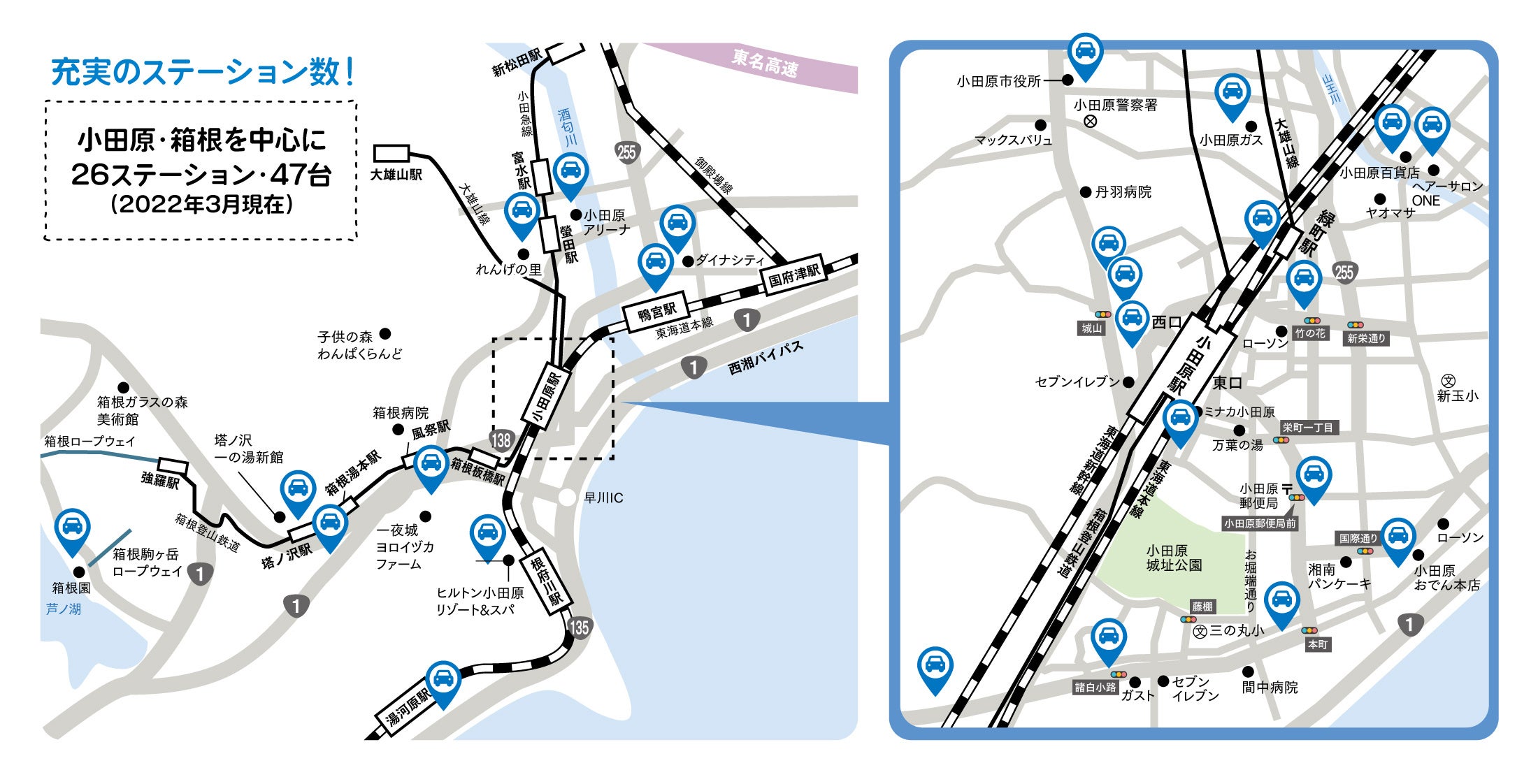 eemoカーステーションは、小田原・箱根エリアを中心に26カ所(約50台)設置されており、また海賊船・箱根ロープウェイの乗り場周辺には、400台分を超える無料駐車場があります。城下町風情や漁港等も楽しめる小田原市内から箱根山内を電気自動車で周り、さらには湖上や空中から箱根の絶景を満喫いただけます。