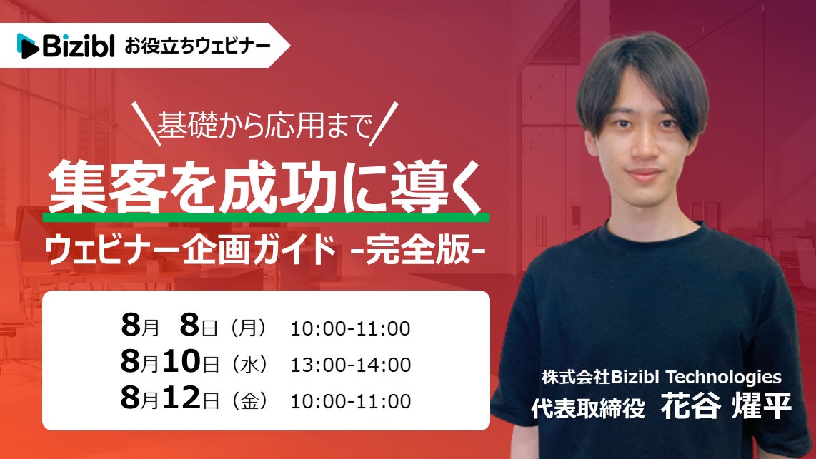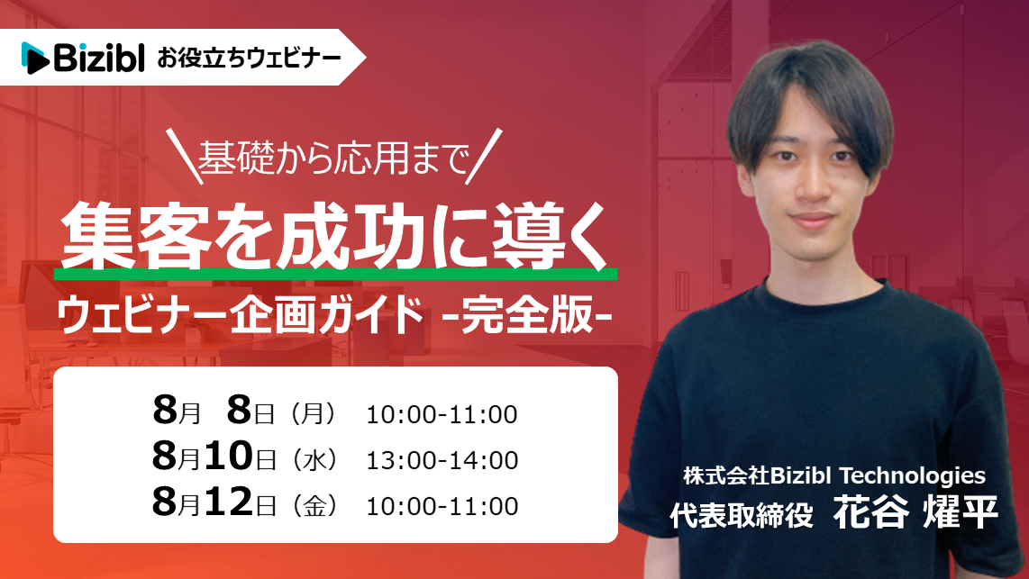 株式会社Bizibl Technologies(本社:大阪市北区、代表取締役:花谷燿平、以下当社)は、『【基礎から応用まで】ウェビナー企画ガイド -完全版-』と題したお役立ちウェビナーを、2022年8月8,10,12日に開催いたします(内容は全て同一です)。