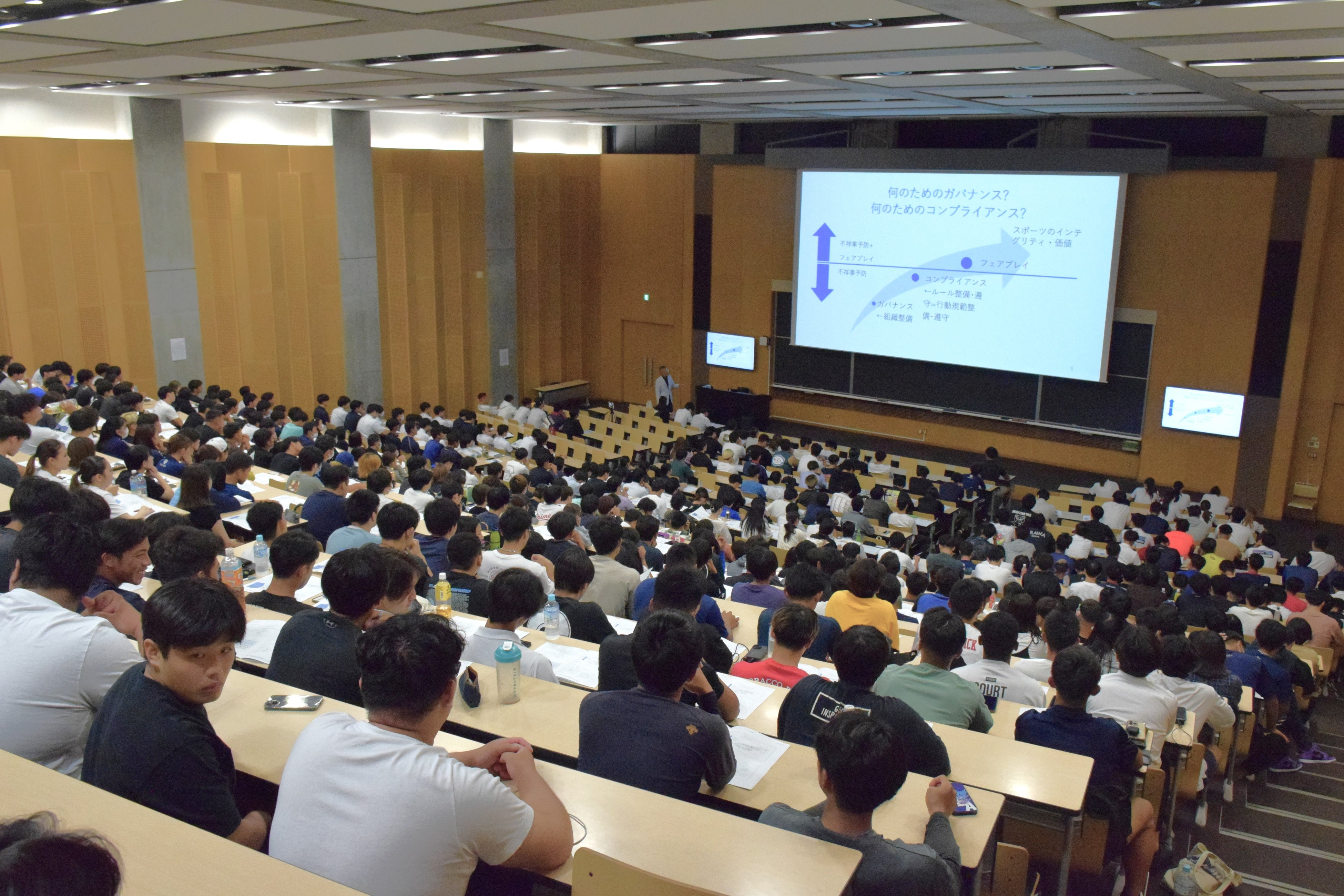 9月23日は学園祭「燦爛祭」の日、授業や部活動がなく多くの学生が参加しやすい日時を選び、この日の夕刻に全学生が参加可能なコンプライアンス研修を実施しました。外部から講師を招き、薬物乱用問題のみならず、部活動などにおいて起こりうる法的問題などを専門的見地から掘り下げ、理解を深める内容で、お祭りの日にも関わらず、運動部活所属の学生を中心に600名弱の学生たちが集まり、日常に潜む危険について学びました。またこの日の研修は動画に収め、本大学の学生なら後日何度でも視聴できるようにしています。