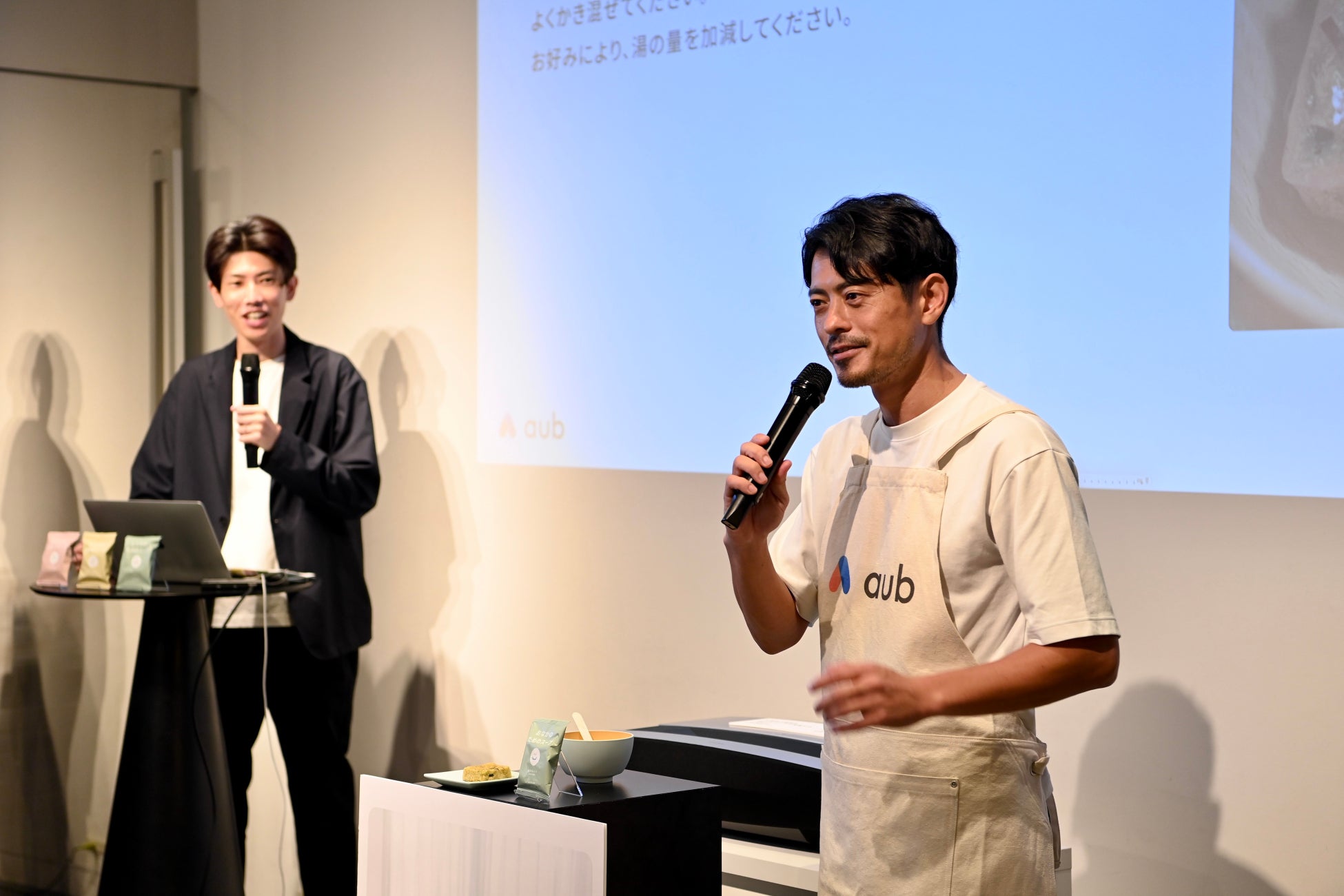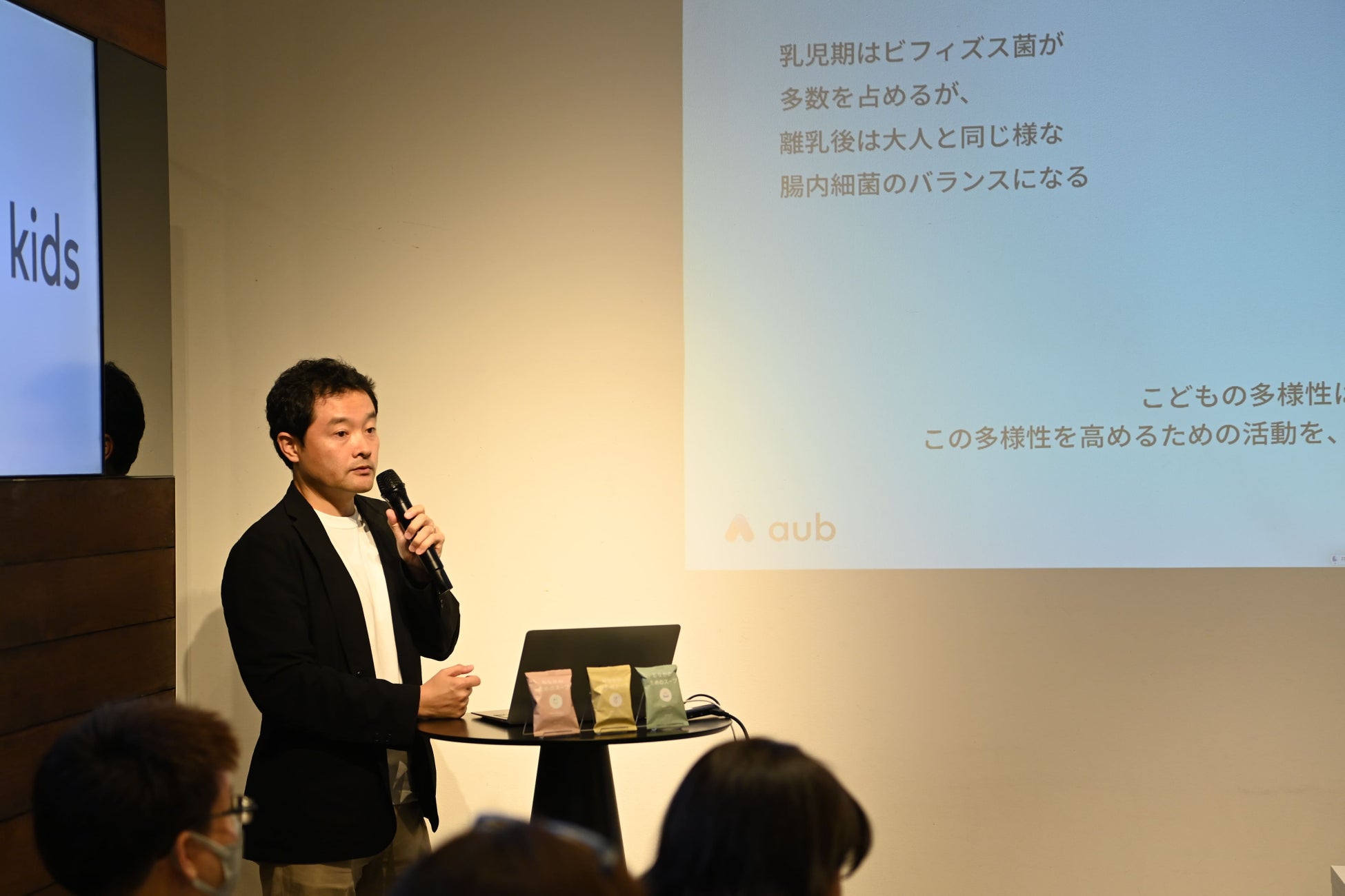 メディア発表会では、当社の代表取締役・鈴木啓太やaub for kids ブランドマネージャー 兼 商品企画責任者・山本大貴が登壇し、新商品「おなかのためのスープ」の商品紹介や実際の調理シーンのデモンストレーションのほか、“腸内細菌の研究者”で、当社の研究統括責任者・冨士川凛太郎による、「こどもと腸」に関する講演も実施し、免疫やアレルギーの観点からこどもにとっての腸育のメリットや、注目の研究について紹介しました。