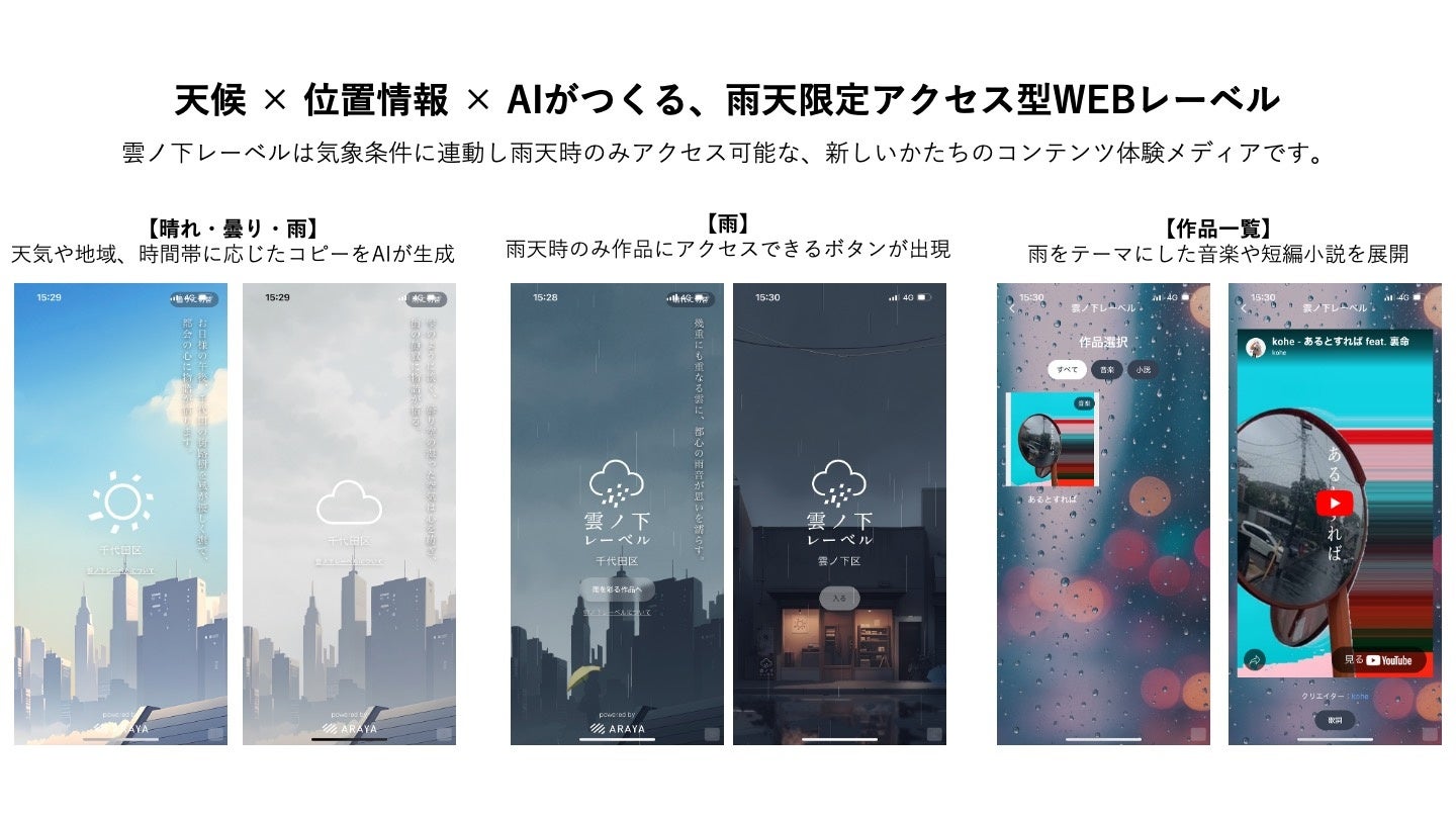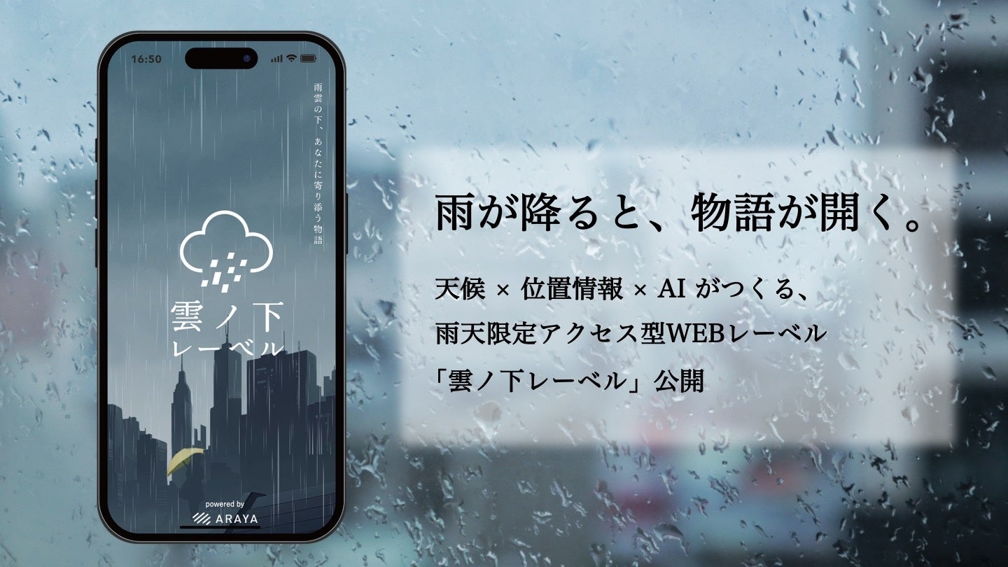 人工知能(AI)やニューロテクノジーの研究開発・ソリューション提供を手掛ける株式会社アラヤ(所在地:東京都千代田区、代表取締役:金井良太、以下「アラヤ」)の社内ラボ「Visionary Lab」は、雨天時にのみアクセス可能なWEBアプリ「雲ノ下レーベル」を2025年6月、梅雨にあわせて公開します。本プロジェクトでは、位置情報と気象APIを連携させ、ユーザーの現在地に雨雲がかかっている場合にのみ作品が表示されます。日々変わる空模様と人の感情のゆらぎをつなぎ、音楽や言葉、映像、テクノロジーを通じて、雨天時でしか出会えない物語体験を提供します。