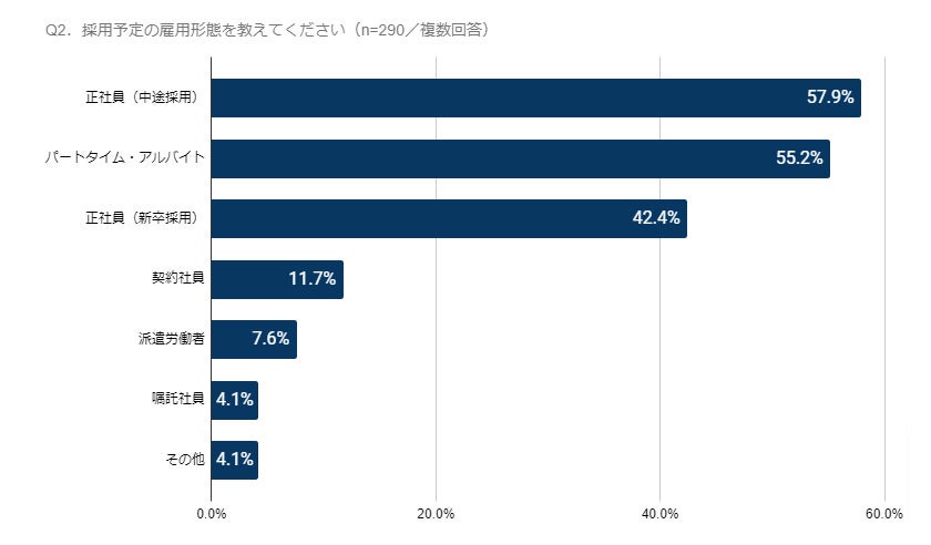 次に採用予定が「ある」と回答した事業所(n=290)へ、雇用形態について質問したところ、「正社員(中途採用)」が1位。2位は「パートタイム・アルバイト」、3位には「正社員(新卒採用)」が続きました。