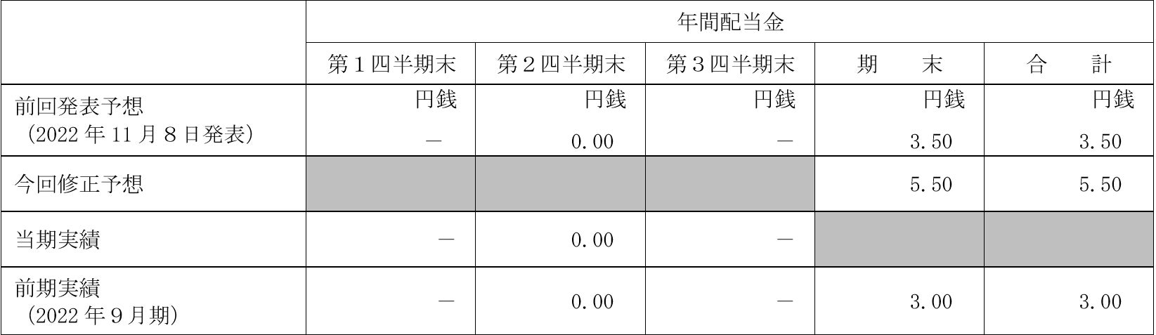 当方針の変更および当期業績の推移を勘案し、2023年9月期の期末配当においては、前回予想の期末配当予想額 1株当たり“3円50銭”を1株当たり“5円50銭”に増配することといたしました。