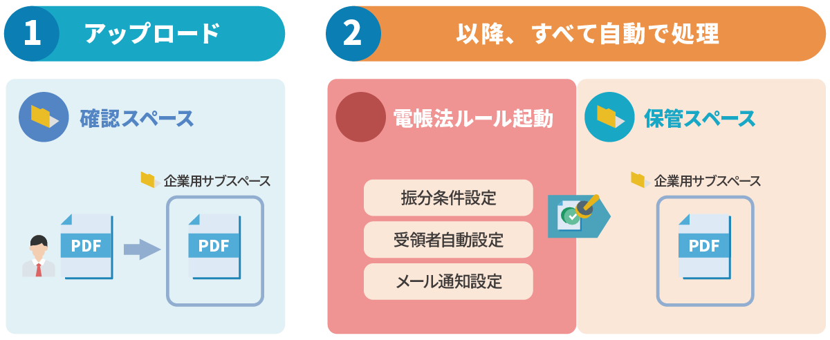 『電帳法ルール』を利用することで、大量の書類の申請から受領、保管先への振り分けや項目の登録、処理完了時に担当者へ通知までをすべて自動化することができます。この強力な機能によりバックオフィスの業務を劇的に削減できます。