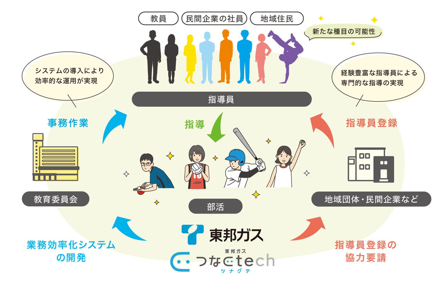 このような流れを受け、東邦ガスは自治体向けソリューション「東邦ガス つなぐtech(ツナグテ)」の一環として、企業人材を中学校の部活動に送り出すとともに、教育委員会の業務負担を軽減する取り組みを開始。