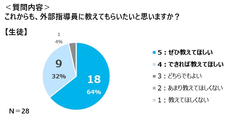 生徒の96%(「ぜひ教えてほしい」64%、「できれば教えてほしい」32%)が、今後も外部指導員による指導を希望