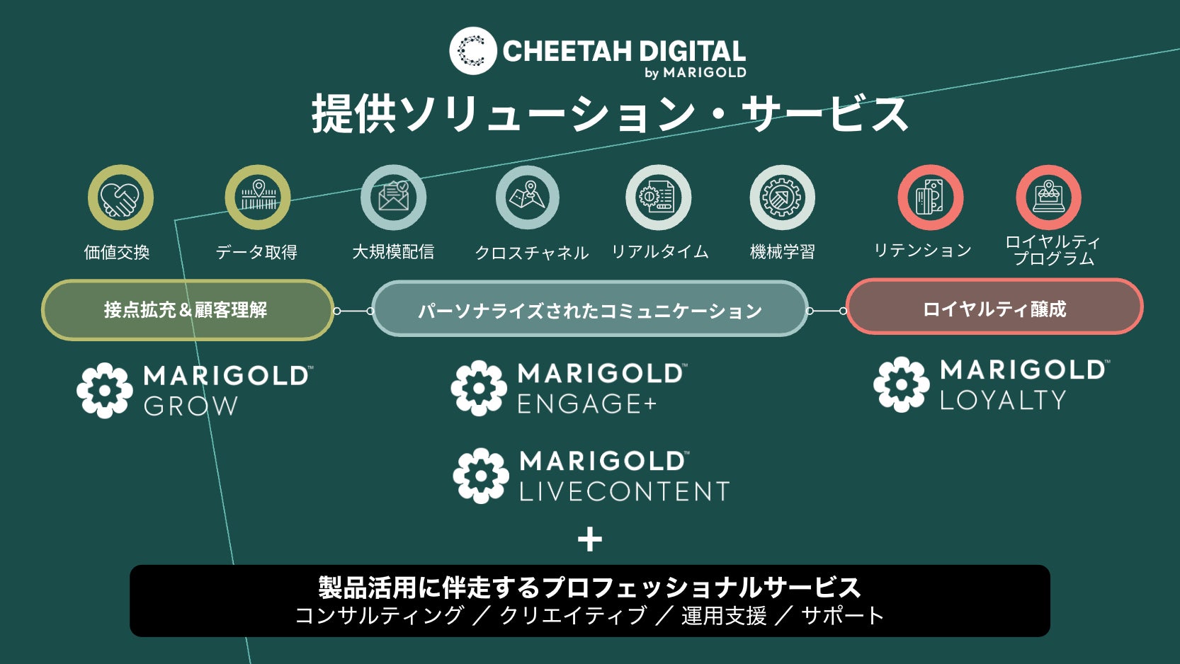 チーターデジタル株式会社は、全世界で40,000以上のグローバル ブランドに対して、マーケティングテクノロジーを提供するMARIGOLD(マリーゴールド)グループに所属しています。日本では、MARIGOLD ENGAGE+(マーケティングオートメーションツール)、MARIGOLD LOYALTY(ロイヤルティ プログラム管理ソリューション)、MARIGOLD GROW(ゼロパーティデータ収集・キャンペーン管理ツール)、MARIGOLD LIVECONTENT (動的パーソナライズメッセージツール)の4製品を提供。ソリューションに加え、コンサルティング・制作・運用などのプロフェッショナルサービスを強みとし、企業のパーソナライズされたブランド体験提供を支援しています。