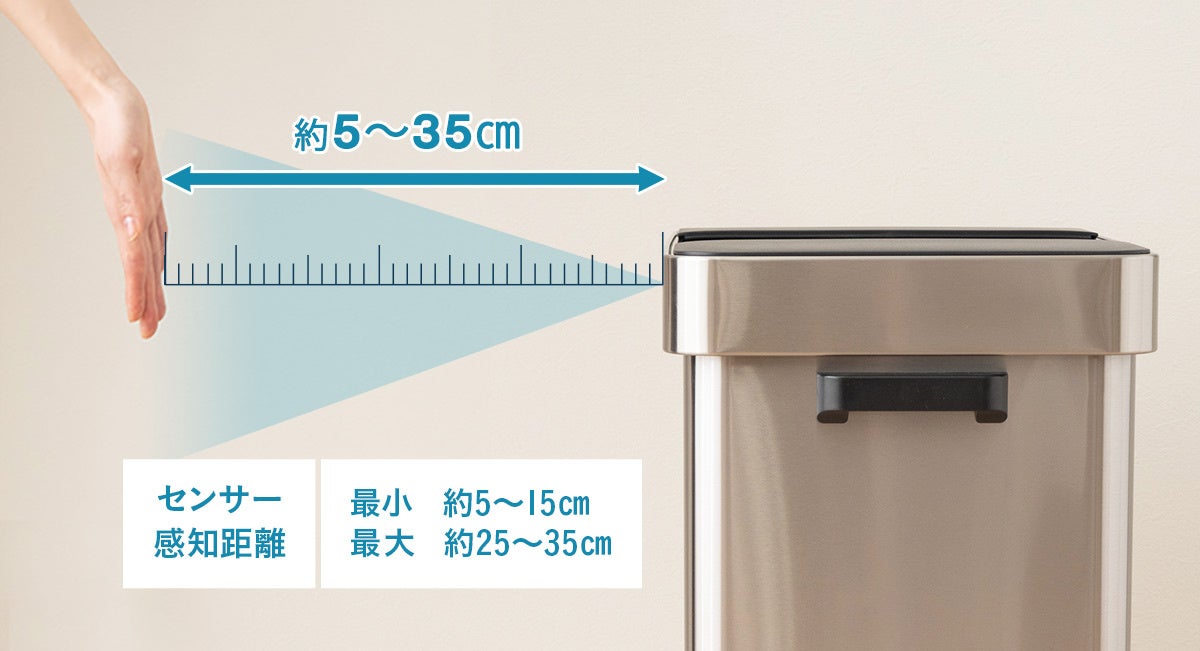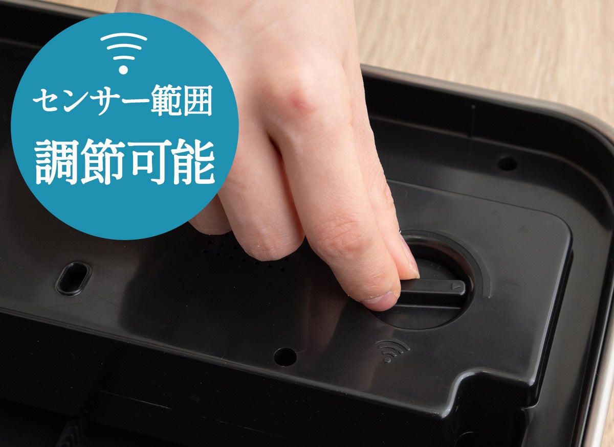 人感センサー搭載なので、蓋の手前に手をかざすだけで自動でふたが開きます。人が感知エリア内から離れると約5秒後に自動で閉まります。タッチスイッチに軽く触れると、手動で開閉することもできます。