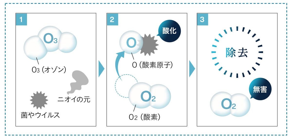 オゾンは、3つの酸素原子で成っており、そのうちの一つの酸素原子が近くにあるウイルスや菌など別の物質と強く結び付くことで(酸化)破壊、分解する性質があります。オゾンは極めて反応性が高く、反応後は酸素に戻るから残留性の心配もありません。強力な消臭・除菌力を持ちながら、環境にも限りなく優しい物質です。